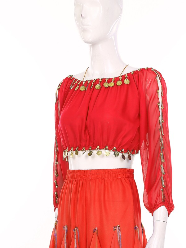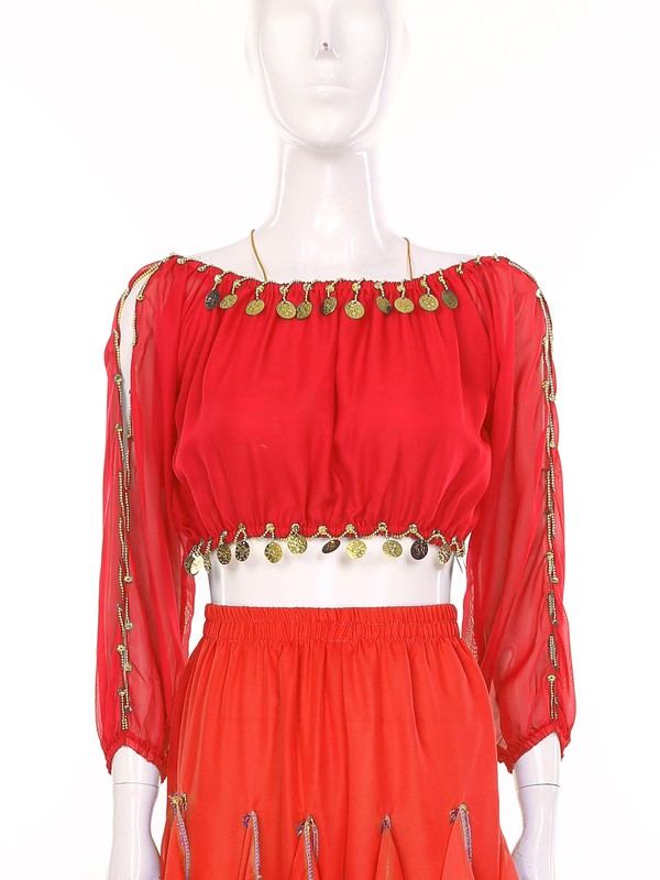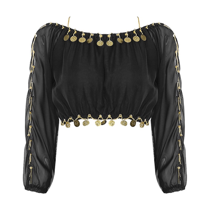 Long sleeve crop top is decorated with plastic beads and sequins, which jingle and sparkle as it moves..