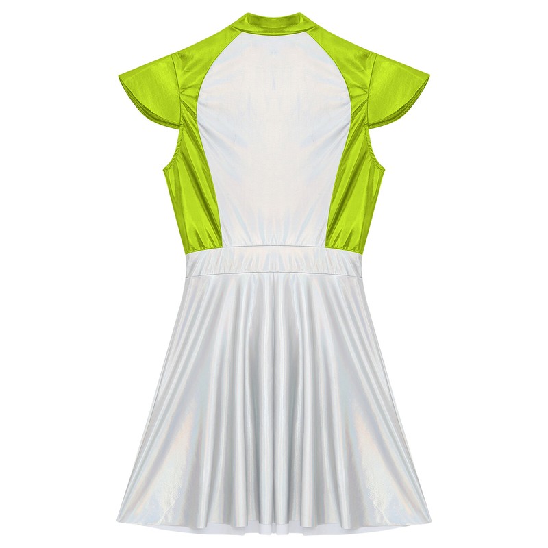 Mock neck, cap sleeve, high waist a-line dress, one layer dress without liner, front zipper closure.