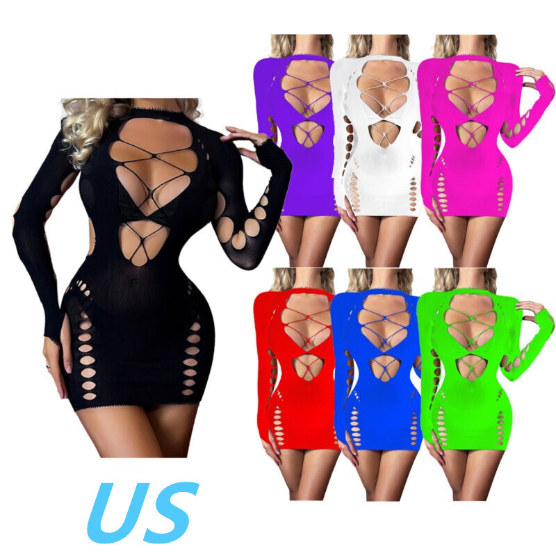 Women’s one-piece erotic hollow out fishnet bodystockings lingerie mini dress, one size fits most.