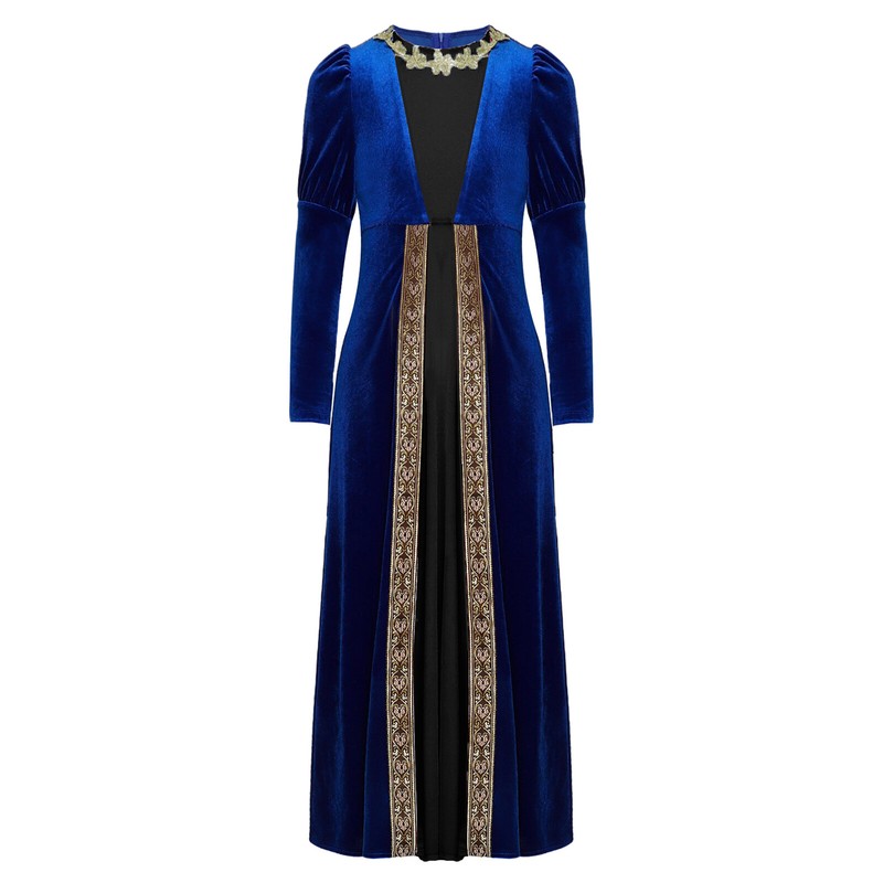 This long velvet dress is decorated with golden flowers around neck, and golden retro royal style pattern.