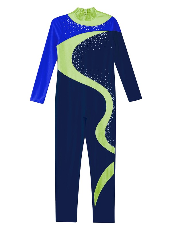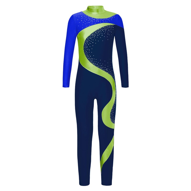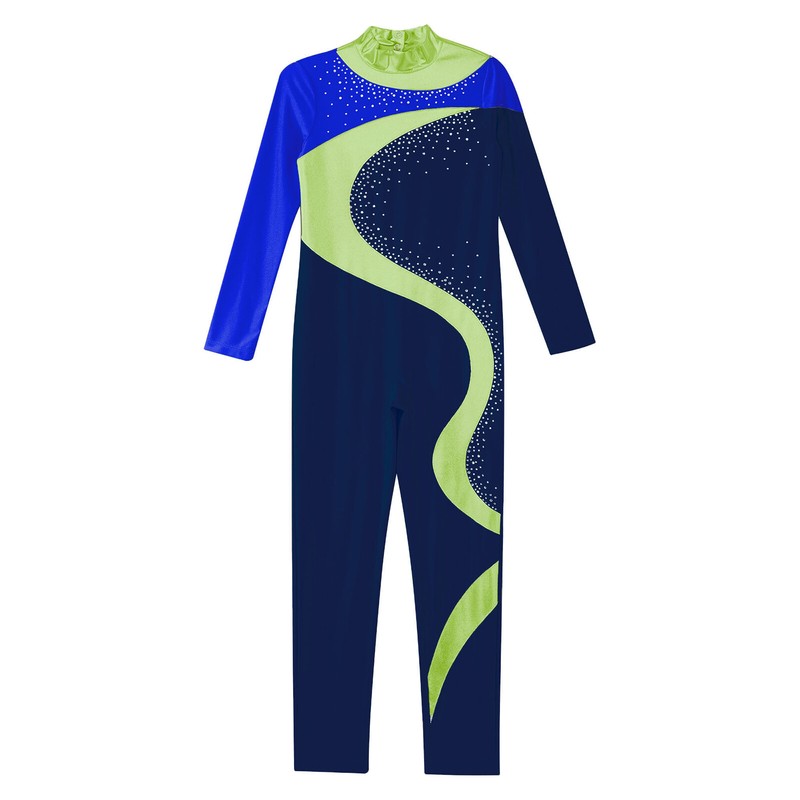 Full length figure skating jumpsuit ensures total movement and flexibility when leaping, dancing or tumbling.