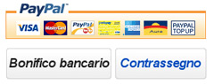 Il pagamento può essere effettuate scegliendo uno dei metodi da noi accettati:PAYPAL (e quindi qualsiasi carta di credito accettata da questo circuito) BONIFICO BANCARIO - CONTRASSEGNO.