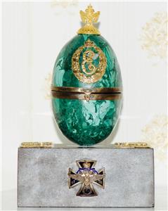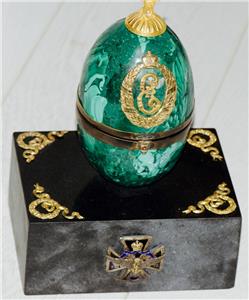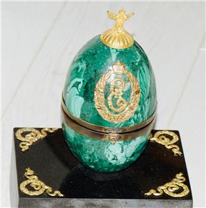 I am pleased to offer from my private collection this extraordinary antique Imperial presentation desk clock, crafted in the form of an Easter egg, is a masterpiece of imperial craftsmanship. Made of hand carved rich malachite semi-precious stone, this rare collectible features the royal monogram of Empress Catherine II the Great (r.1762-1796) and dates back to the 1790s, making it a highly sought-after historical artifact.
