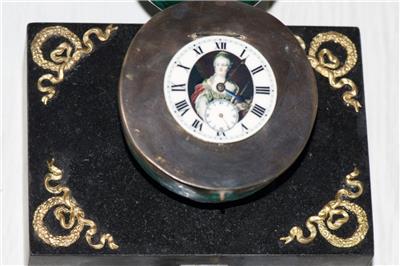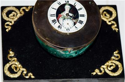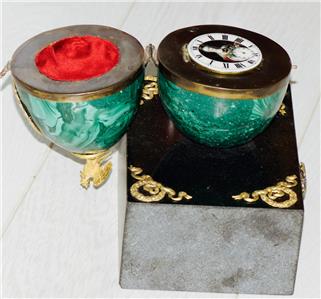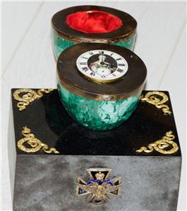 This piece is believed to have been commissioned as an imperial gift, intended for presentation to a distinguished recipient in the Royal court. The use of malachite, a stone highly prized in imperial artistry, combined with the emblems of Catherine the Great, makes this clock a remarkable and authentic item of historical importance.