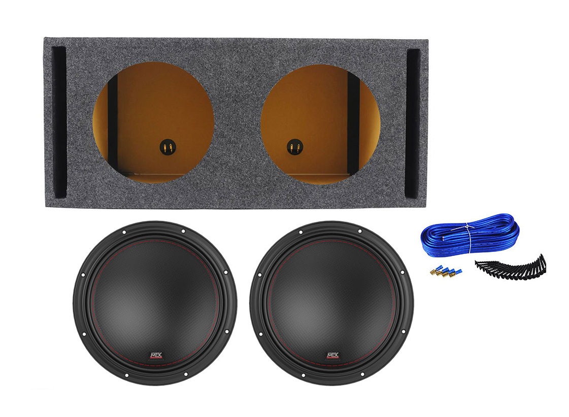 Package: (2) MTX 7512-44 12" 3000 Watt Peak/1500 Watt RMS 4-Ohm Car Subwoofer + Rockville RDV12M Dual 12" 2.0 Cubic Feet (Per Chamber) Dual Vented Subwoofer Enclosure Box - Constructed Using Grade "A" 3/4" MDF Wood, Proudly Made in America! + Dual Sub Box Enclosure Installation Kit: Speaker Wire, Screws, Spade Terminals