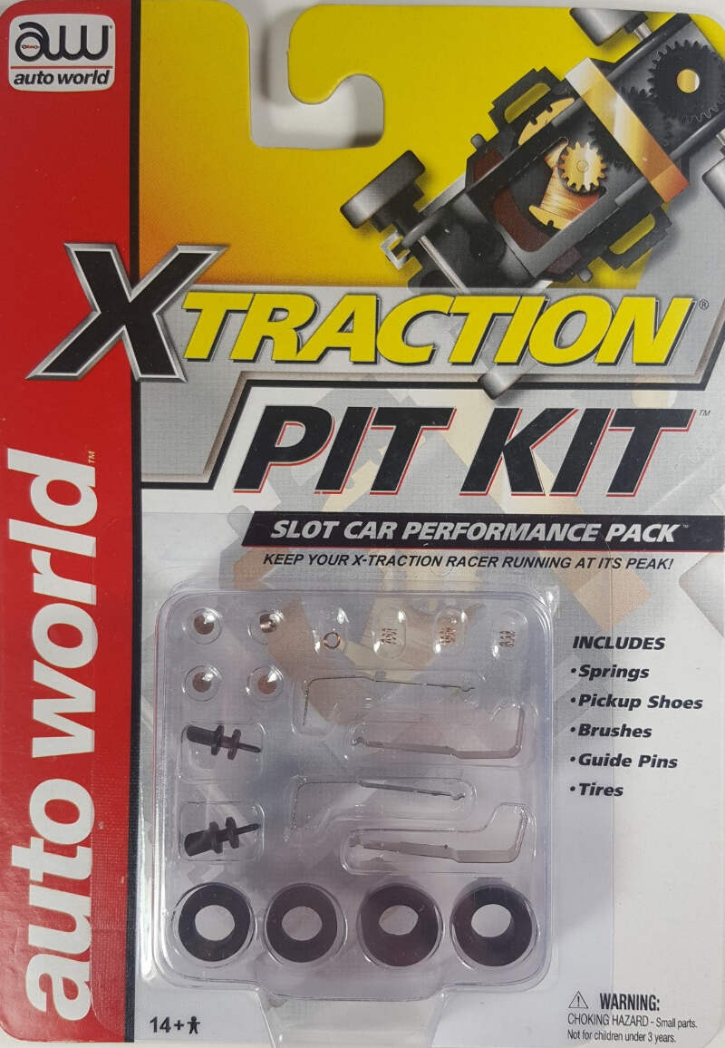 The X-Traction Pit Kit includes replacement parts to keep your electric slot racer performing at its best. Includes 2 front and 2 rear tires, 4 pick-up shoe contacts, 4 pick-up shoe springs, 4 motor brushes and two replacement guide pins.