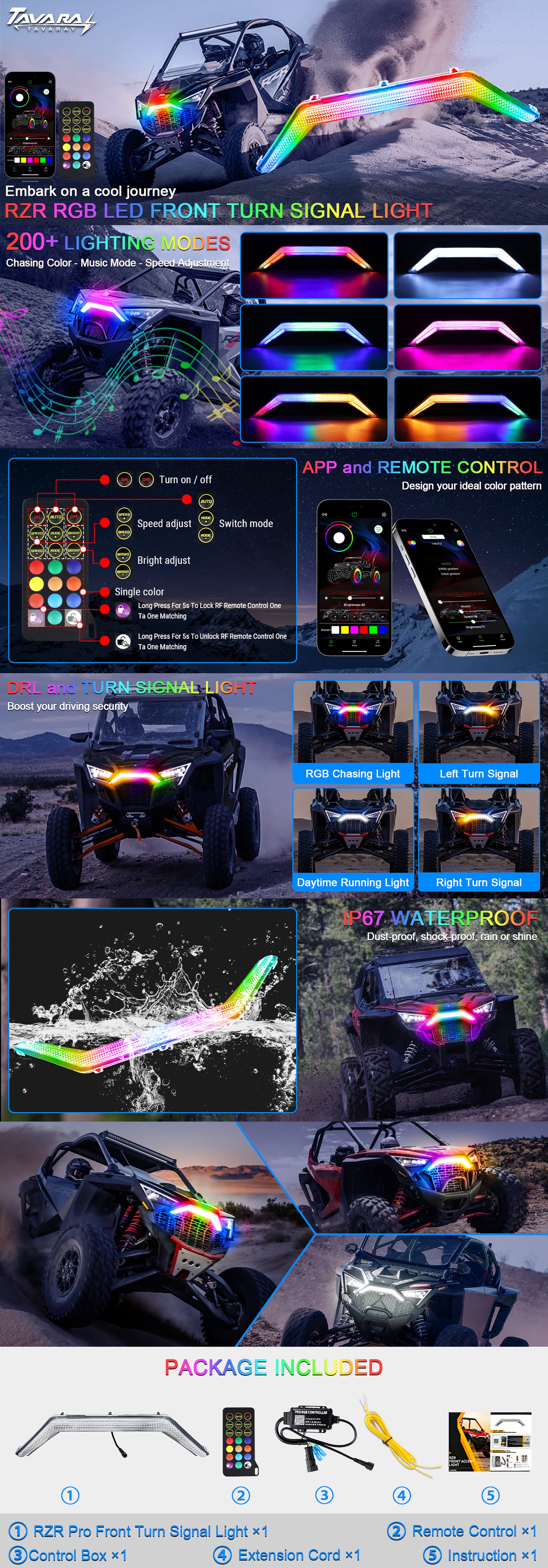 • Multicolor & Music Sync: Tavaray RZR PRO fang lights feature 54 high-performance LEDs with over 178 RGB chasing color options. Customize your ride with RGB daytime running lights (DRL) and amber LED turn signals. You can DIY your RGB color modes, and with music sync, the lights flash in sync with your tunes, making your polaris stand out in any crowd.