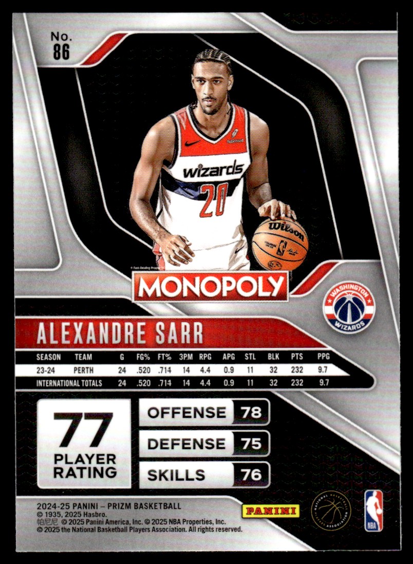 | Alexandre Sarr Rookie #86 2024-25 Panini Prizm Monopoly Washington Wizards |