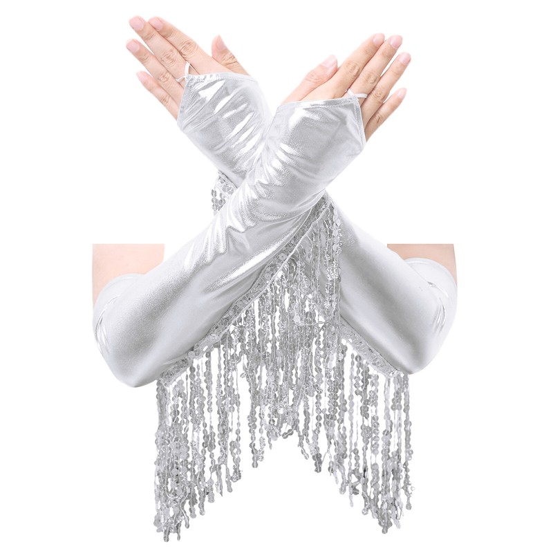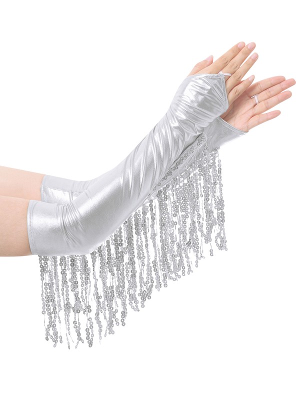 Metallic shiny gloves trim with sequin tassel, making you dazzling and eye-catching with each movement. The length is about 42.5cm/16.5 inch.