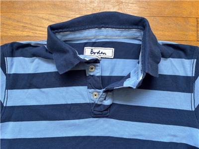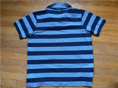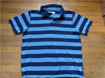 Description: Lt blue and navy stripe pique polo shirt. Men's Large. 100% cotton. Measures 24 inches from armpit to armpit across chest and 27 inches from middle of shoulder seam to hem.