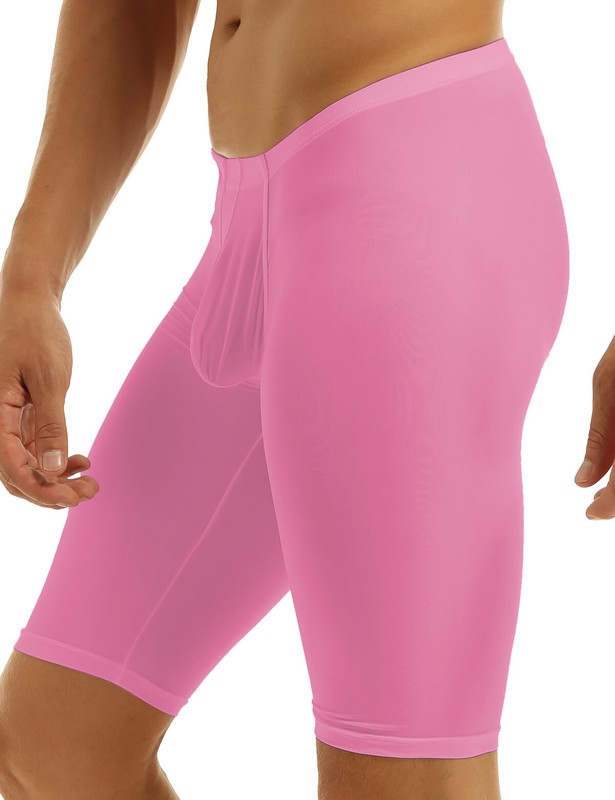 Elastic waistband with bulge pouch, square legs, tight-fitting style, pull on closure.