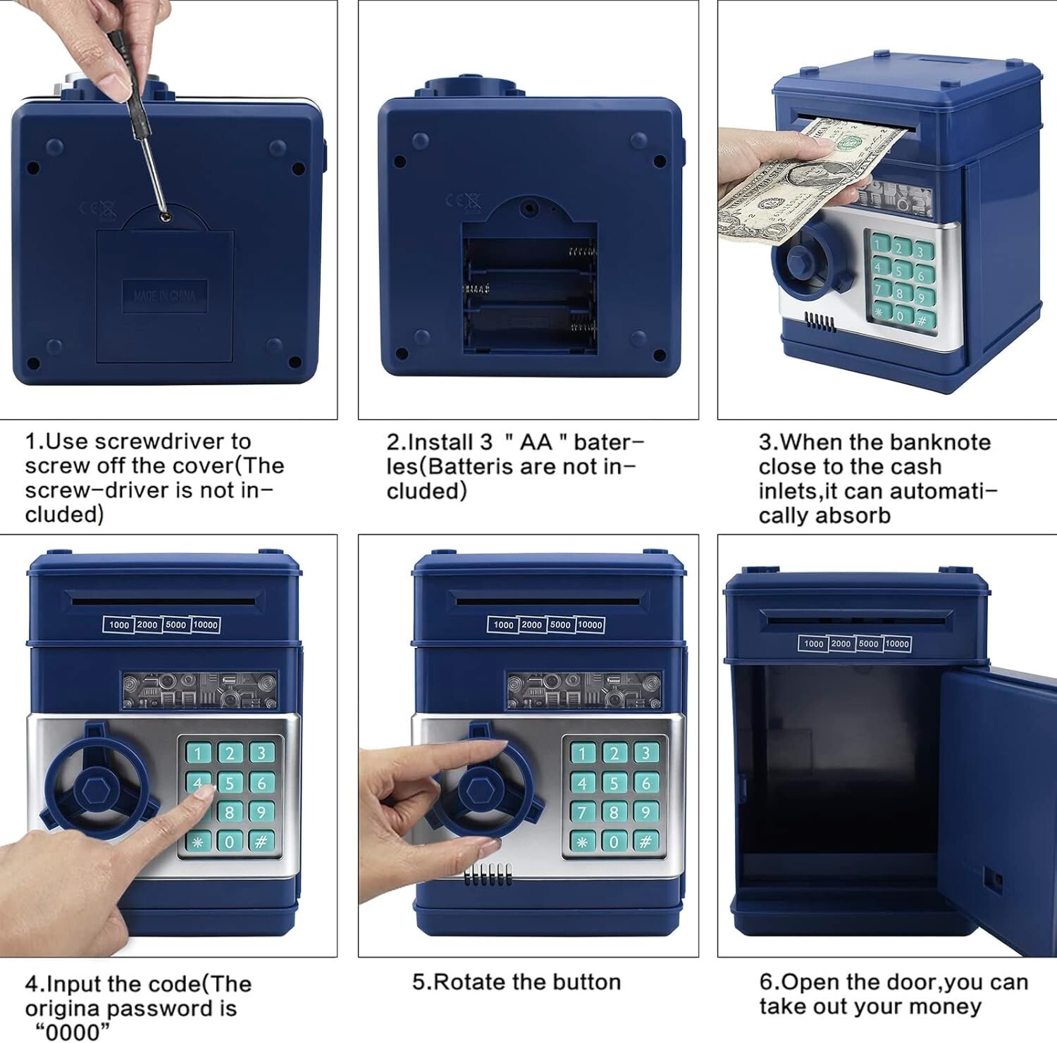 Versatile usage: Accepts both cash and coins, transitioning seamlessly between a savings box and a password-protected safe.