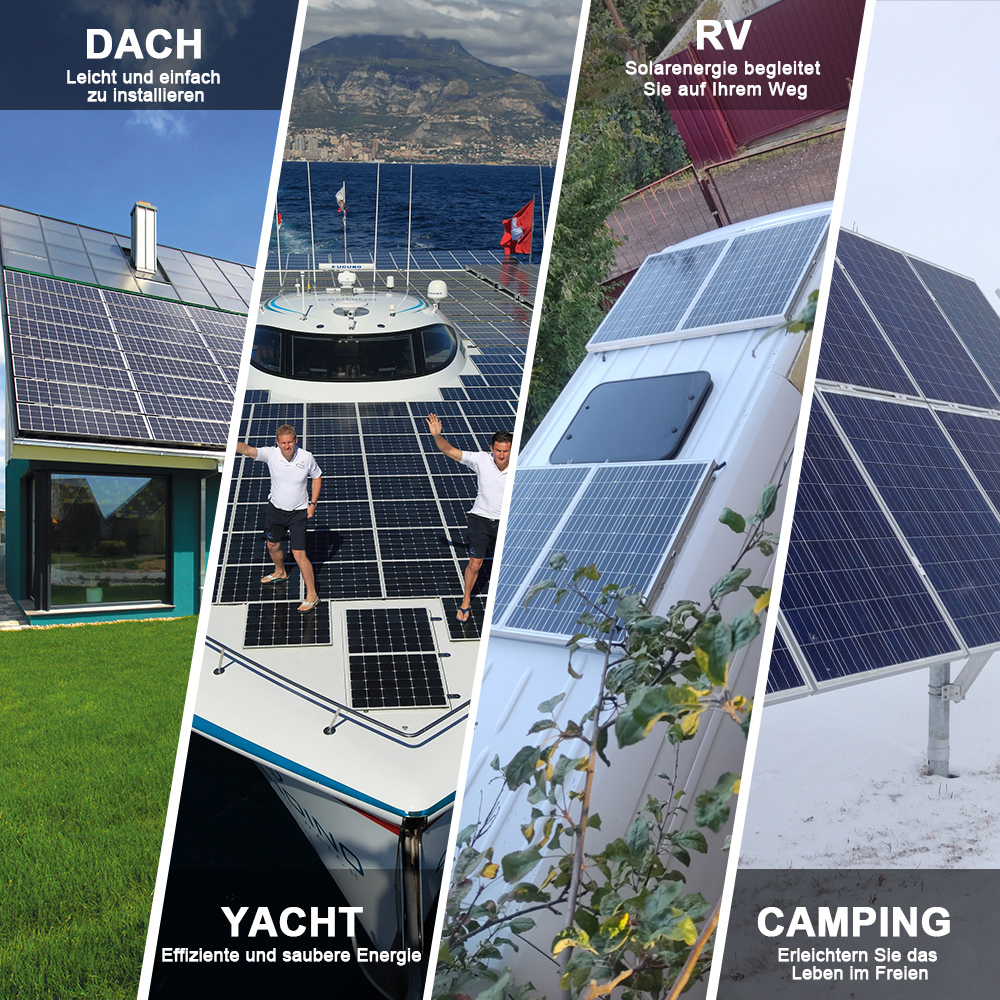 Wohnmobile, Hütten, Meeresgebiete, Heimstromversorgung und mehr. Die Paneele verfügen über leichte Aluminiumrahmen und bruchsicheres Glas, wodurch sie sich perfekt für Außenanwendungen eignen.
