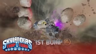 Fist Bump war lange Zeit der schlafende Beschützer des Blubberbambuswalds, doch er erwachte aus seinem langen Winterschlaf, als eine Horde garstiger lila Greebles mit riesigen Steinbrecher-Maschinen ankam. Sie wollten eine neue Basis bauen und richteten mit ihren Maschinen Chaos an - sie rissen das Land auf und spuckten gigantische Rauchwolken aus, die sich in die verzauberte Luft auftürmten. Als Fist Bump das sah, wurde er wütend. Mit seinen riesigen Steinfäusten hämmerte er mit aller Kraft auf den Boden und verursachte ein riesiges Erdbeben, das enorme Schockwellen auf das Greeble-Lager losließ. Danach waren deren Maschinen nur noch Schrott und die Greebles liefen in Panik fort. Diese Heldentat sprach sich zu Terrafin herum, der Fist Bump Meister Eon vorstellte. Nun ist Fist Bump ein Skylander und lässt das Böse erzittern, wo immer er ist!