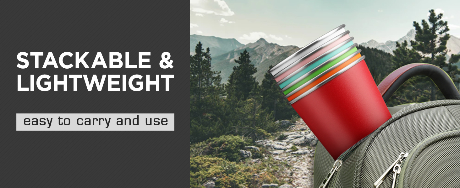 ✅Stackable Cups: The stainless steel drinking glasses are stackable, they can be stacked together when not in use and without taking up space; Lightweight, easy to carry with no burden, can be carried freely in your backpack.