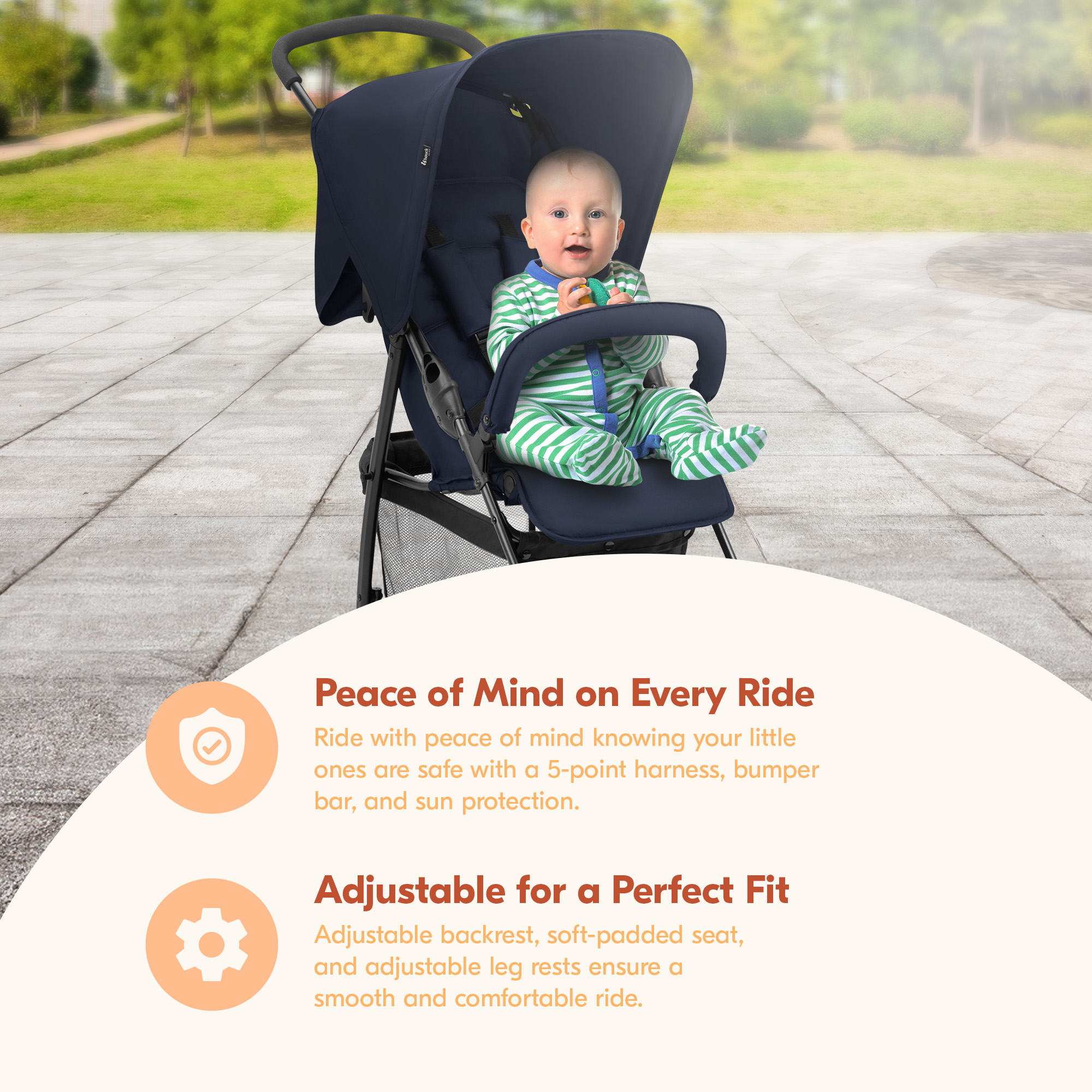 • Features a 5-point belt, bumper bar, and canopy with sun protection, giving you peace of mind that your little ones ride safely