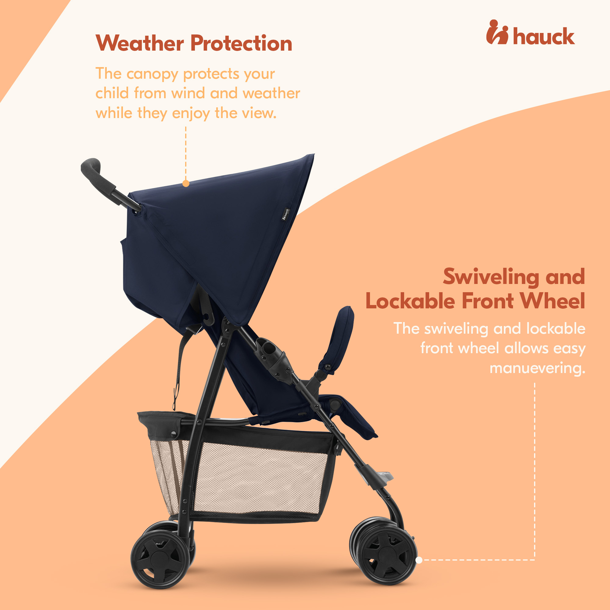 • Easy to maneuver thanks to the lightweight suspension and swiveling lockable front wheels
