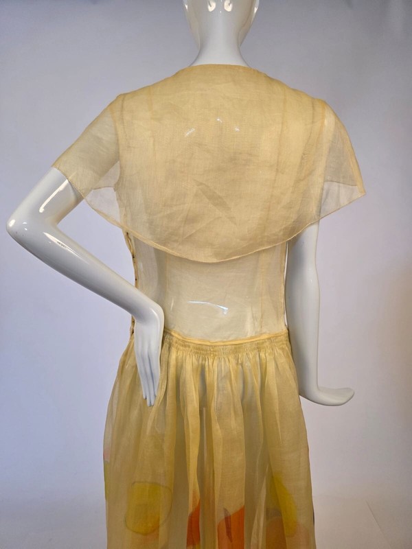 DESCRIPTION: NOTE THAT THIS DRESS IS TAKEN BOTH WITH AND WITHOUT A CRINOLINE BENEATH. THE CRINOLINE IS NOT INCLUDED IN THE SALE BUT SHOWS THE LARGE ROBE DE STYLE VOLUME OF THE SKIRTING AND I SUSPECT THAT THIS ONE HAVE HAD A SLIP WITH PANNIER SIDES.