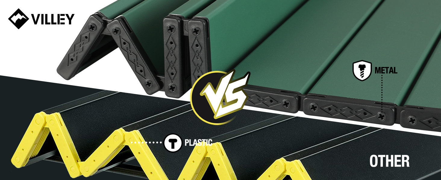 Each folding table top plate is hinged with metal nails, which is stronger and flatter than a table top connected by plastic nails or bungee cords.