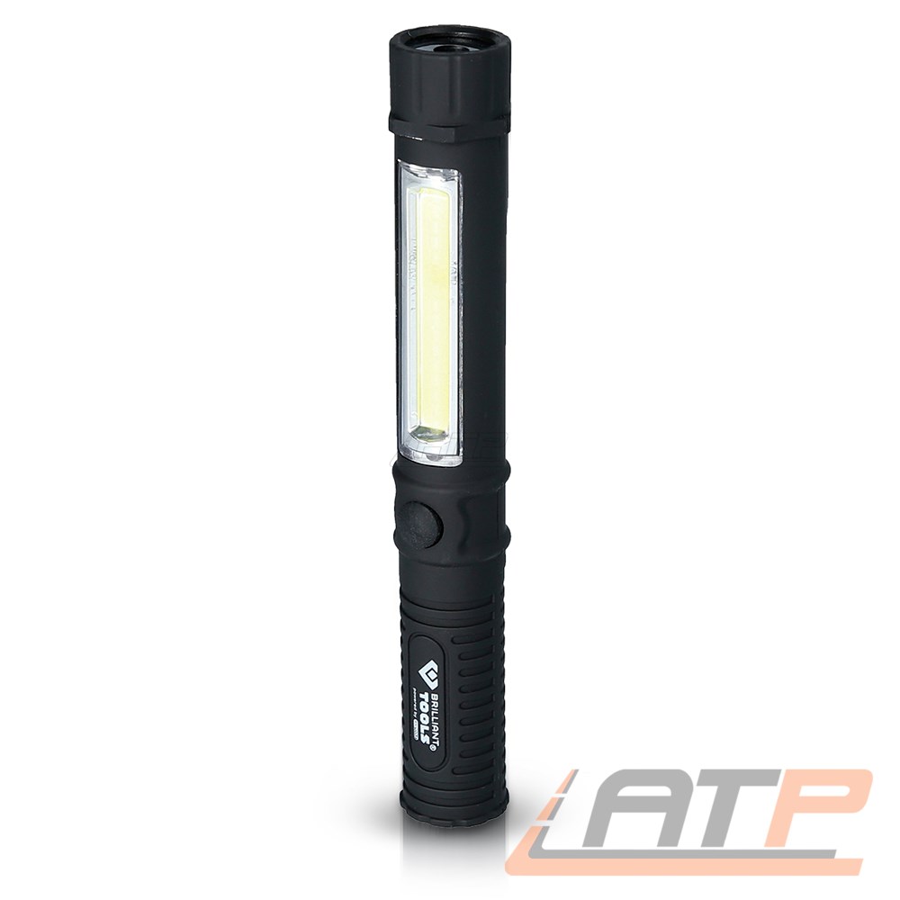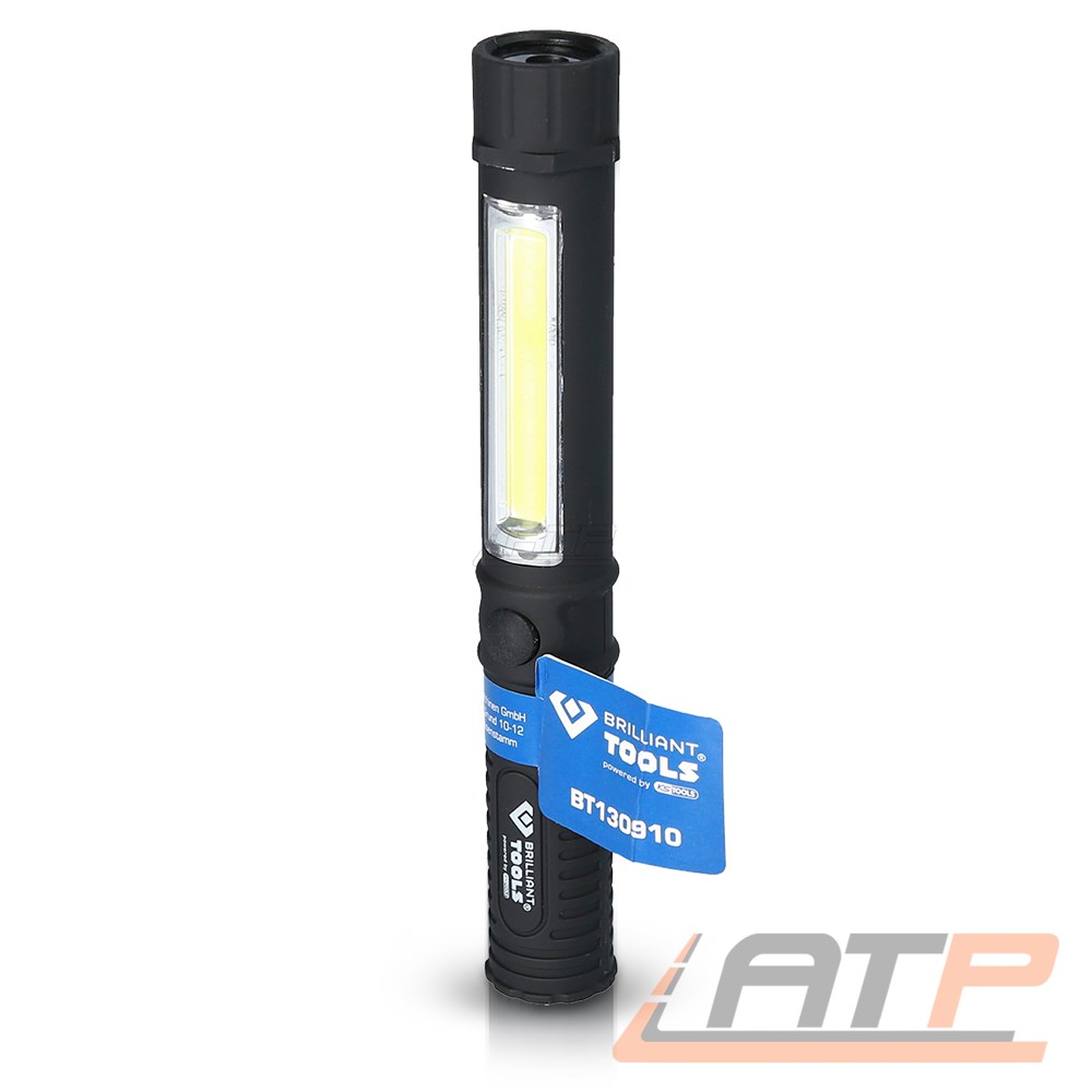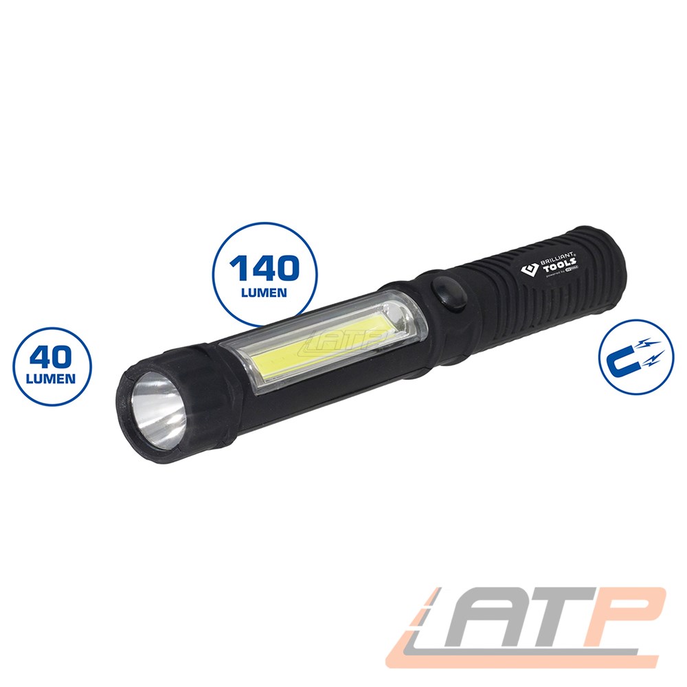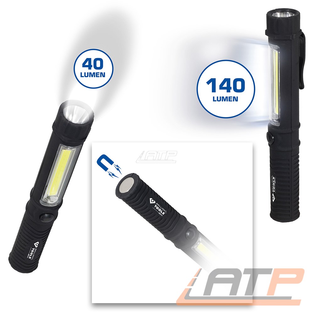 Mit der BRILLINAT TOOLS 2in1 COB-Taschenlampe BT130910 haben Sie jetzt in allen Situationen die perfekte Lichtquelle zur Hand: Auf Reisen, bei Nachtwanderungen, beim Camping, in der Freizeit, für handwerkliche Arbeiten oder bei Autopannen. Als normale Taschenlampe sorgt die leuchtstarke Highpower-COB-LED mit 1 Watt bei jeder Gelegenheit für superhelles Licht - viel heller als mit einer herkömmlichen LED. Und dabei verbraucht dieser innovative Lichtspender nur ganz wenig Batterie-Strom. Als sprichwörtliches Highlight verfügt die universelle 2in1-Lampe zusätzlich über eine seitliche Arbeitsleuchte mit ultraheller COB-LED: Die superpraktische Lichtleiste leuchtet bequem eine größere Fläche aus. Ideal für Reparaturen, bei Bastelarbeiten, beim Camping, als Lese- und Pannenleuchte. Mit dem Magnetfuß befestigen Sie Ihre neue Taschenlampe ganz einfach z.B. an der Autokarosserie. Dank des praktischen Gürtelclips haben Sie die geniale 2in1-Leuchte außerdem immer schnell zur Hand. Das schlanke gummierte Gehäuse steckt auch rauere Einsätze z.B. beim Heimwerken locker weg.