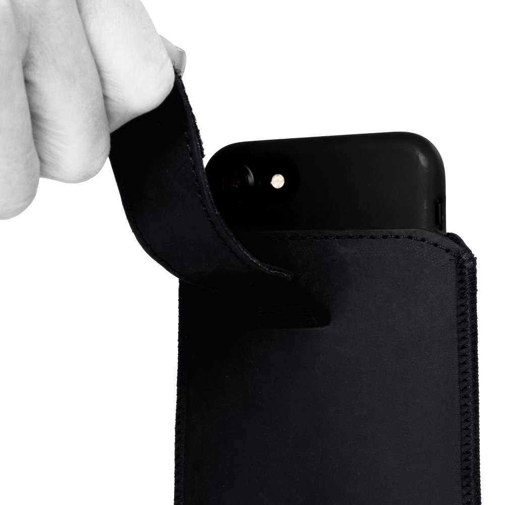 Praktisch: Mit Hilfe der Lasche wird das Smartphone schnell aus der Tasche herausgezogen, bei einstecken des Handys zieht sich die Lasche automatisch zurück