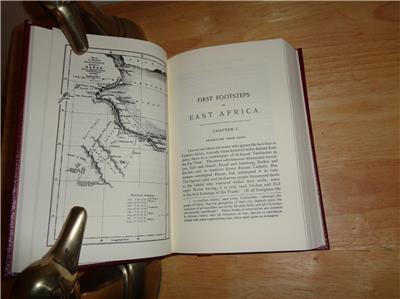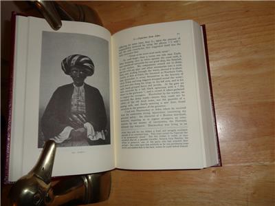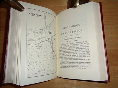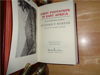 FIRST FOOTSTEPS IN EAST AFRICA: Or An Exploration of Harar by Richard F. Burton was published by the Easton Press in 1992/2007. This is their "COLLECTOR'S EDITION". ************************************************* The EASTON PRESS is a publisher of fine leather books covering a wide range of topics, including, autobiography, biography, children's books, fiction, history, philosophy, poetry, politics, reference, religion, science and exploration. Each Easton Press volume is bound in high quality genuine leather. Hubbed spines accented with precious 22kt gold. Printed on archival acid-neutral pages that are thread-sewn, not just glued. Page ends gilded on all three exposed sides to protect against dust. Deep tooled ornamentation into the leather and satin ribbon markers. ********************************* FIRST FOOTSTEPS IN EAST AFRICA is a seminal work of Africana recording Burton's first expedition into Somalia. His purpose was to explore the forbidden Moslem city of Harar, a city whose walls no European had ever penetrated, as well as to gather information about the headwaters of the Nile. He traveled in the same disguise that took him to Meca, as Haji Mirza Abdullah, an Arab merchant. On this journey, Burton received the famous spear wound to his face during an attack by Somalis while encamped on the beach at Berberah. *************************************************** Illustrated with black and white photographs, drawings and maps. ********************************* THE BOOK IS IN FINE CODITION. THERE IS A PARTIAL ORIGINAL PUBLISHER'S WRAP. THERE IS SOME WEAR ON THE SIDE GILT (SEE PHOTO). ******************************** Sir Richard F. Burton was a British geographer, explorer, translator, writer, soldier, orientalist, cartographer, ethnologist, spy, linguist, poet, fencer and diplomat. He was known for his travels and explorations within Asia, Africa and the Americas, as well as his extraordinary knowledge of languages and cultures. According to one count, he spoke twenty-nine European, Asian and African languages. FIRST FOOTSTEPS IN EAST AFRICA was published after Burton's death, and edited by his wife, Isabel Burton, enjoy. Note: any glare is from my camera, note the book. |