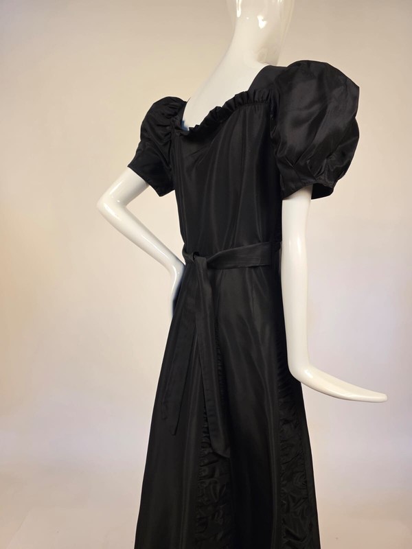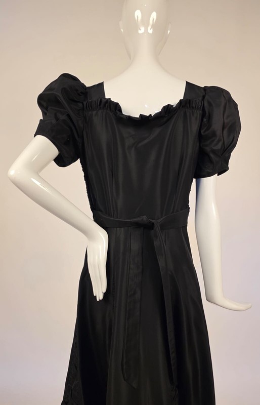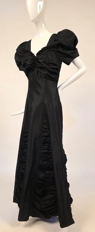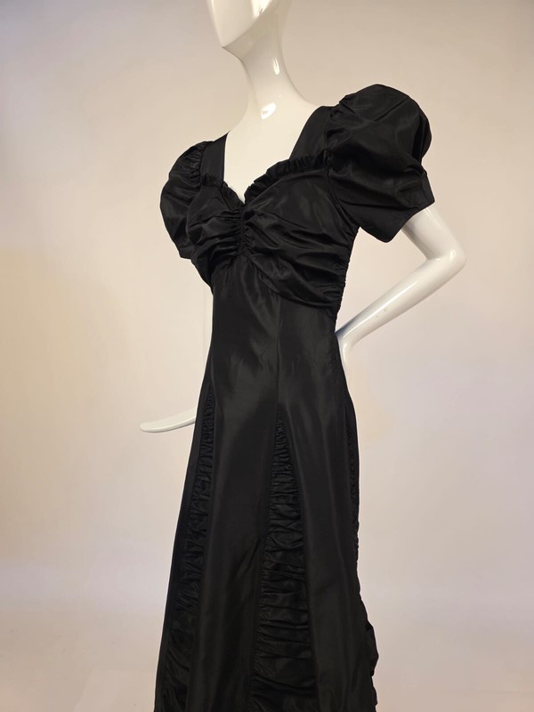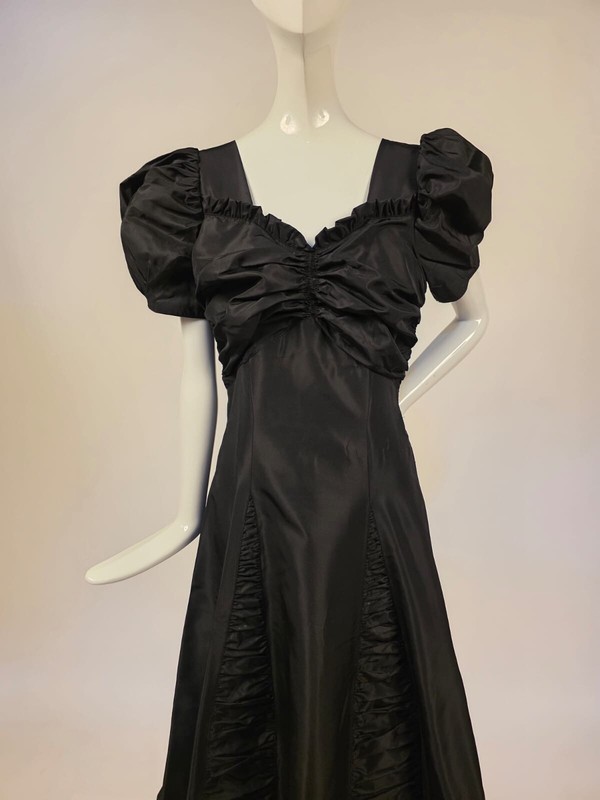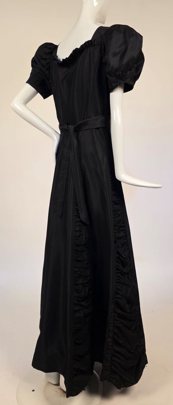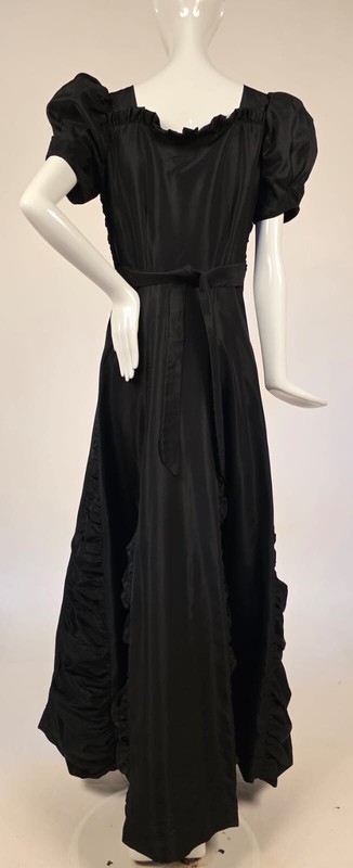 DESCRIPTION: FASHIONED OF A CRISP BLACK TAFFETA WITH RUCHING IN THE CENTER BUST AND RUFFLES ATOP