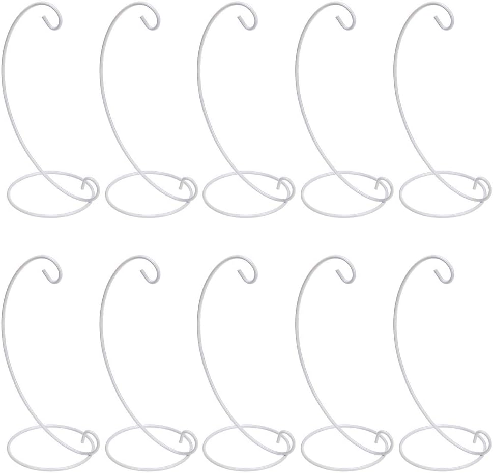 OwnMy ornament display stand hanger with gracefully curved design could adds elegance to any room, it’s great to showcase your favorite ornaments and trinkets!Features:- Classic black and simple design hanging rack goes well with any home decor. It’s suitable for displaying on a desk, tabletop, and mantel, curio cabinet, in the kitchen, bathroom, or dining room.- Ornament display hanger provide a simple way to display your favorite collectible holiday decorative ornaments, glass globes, garden décor, small lanterns, plant terrariums or witch balls.- Iron hanging racks can be a wedding gift or birthday gift for your friend or family. It is great for displaying collections of hanging decorations or collectibles.- Ornament stand is made of durable iron with 4” wide base makes it sturdy and balanced for hanging your craft projects, no need to worry about it tipping over.Specification:Material: IronColor: White coatedBase Diameter: 4”Stand Height: 9”Package Included:10 * Ornament Display Stand