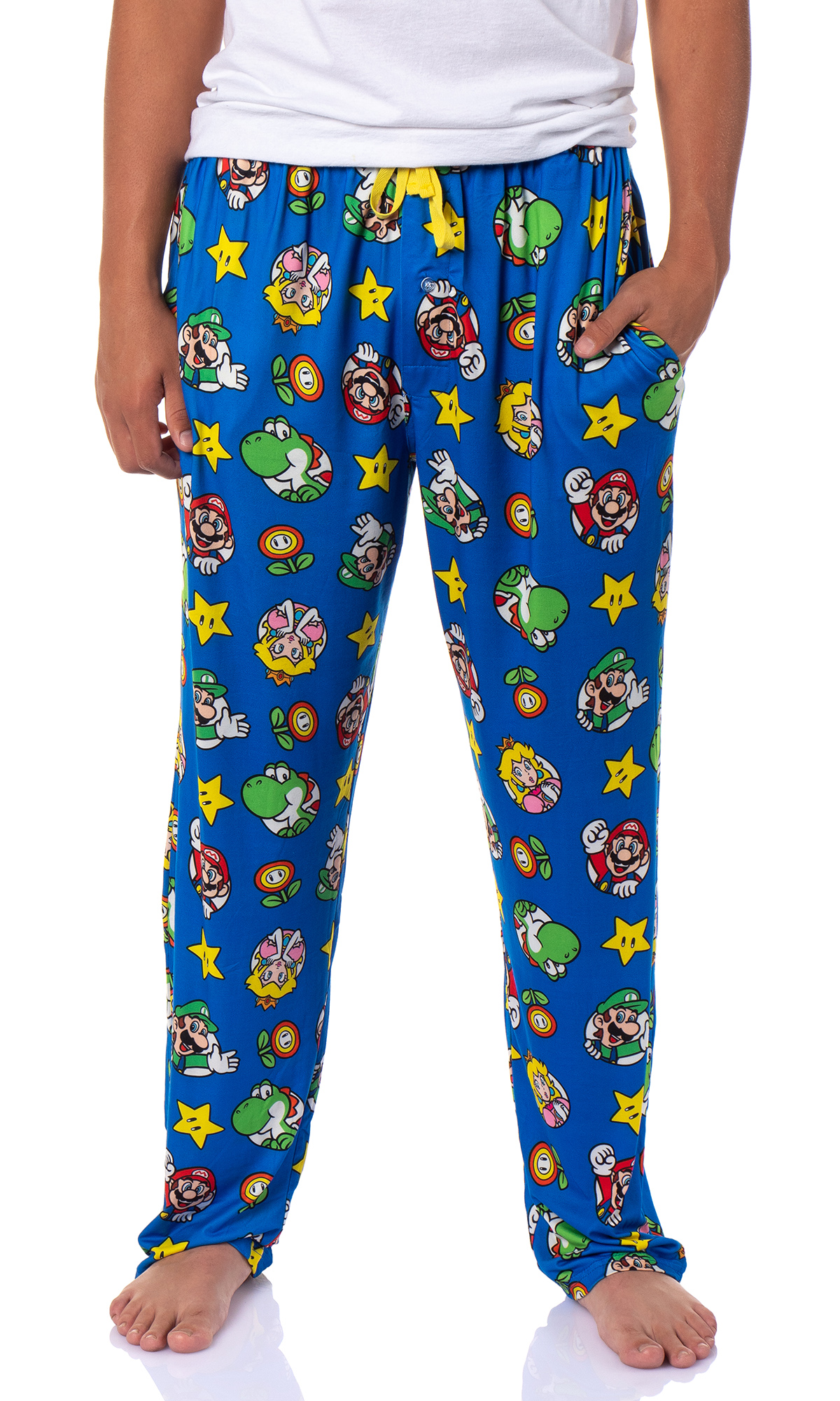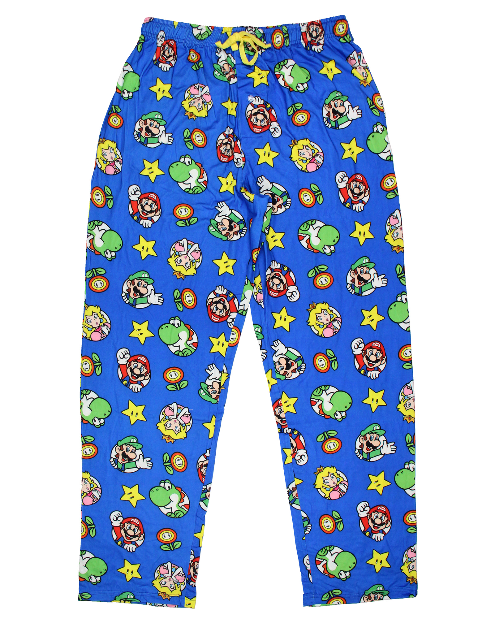 Immerse yourself in the vibrant world of the Mushroom Kingdom with these Nintendo Men's Super Mario all-over print (AOP) soft sleep lounge pajama pants. Designed with both comfort and nostalgia in mind, these pajama pants feature a lively design showcasing beloved characters like Mario, Luigi, Princess Peach, and Yoshi, along with Super Mario power-ups, including the Super Star and Fire Flower. The colorful characters pop against the soft fabric, making these pants a great choice for any Super Mario fan. The stretchy drawstring waistband Provides a customizable, snug fit, while the button-up fly adds a practical touch. these pajama pants are great for a cozy night in, whether you're binge-watching your favorite shows, catching up on sleep, or conquering levels in your favorite video