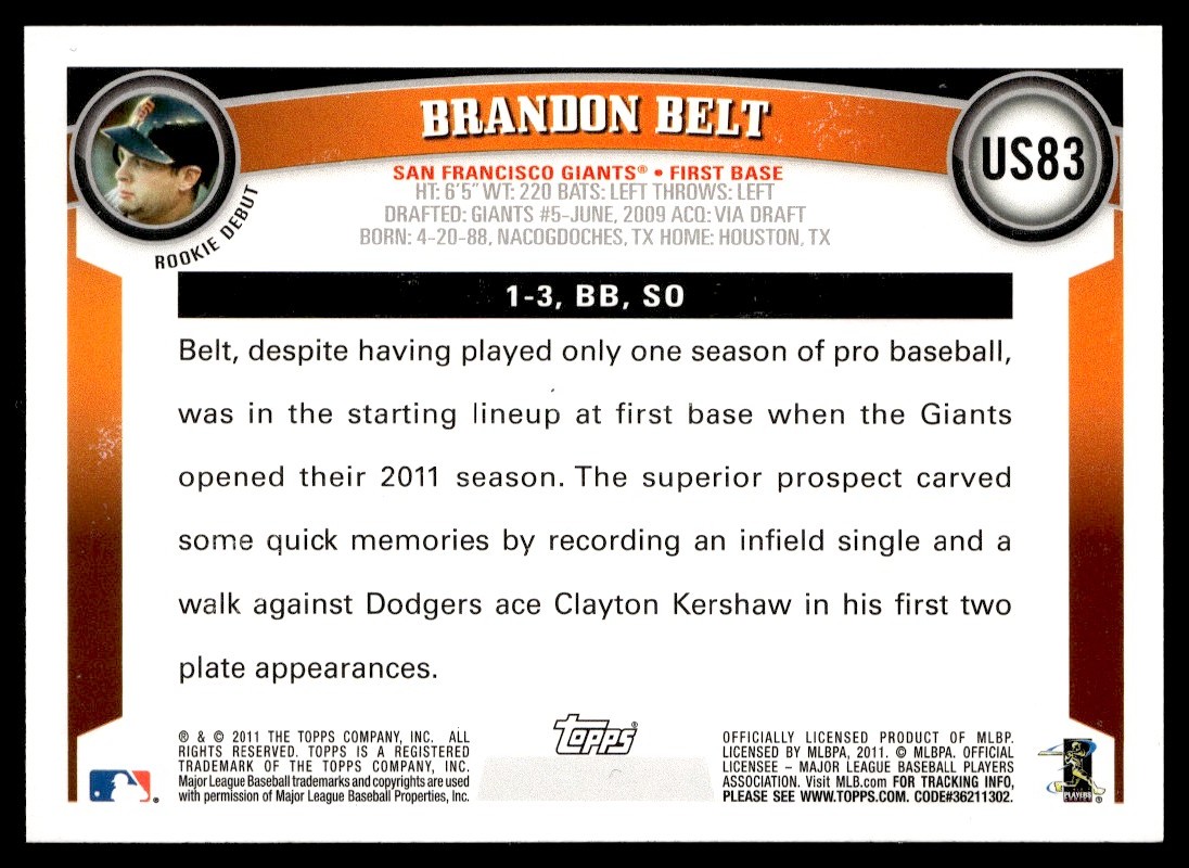| 2010 TOPPS DIAMOND ANNIVERSARY BRANDON BELT ROOKIE SAN JOSE GIANTS #US83 |