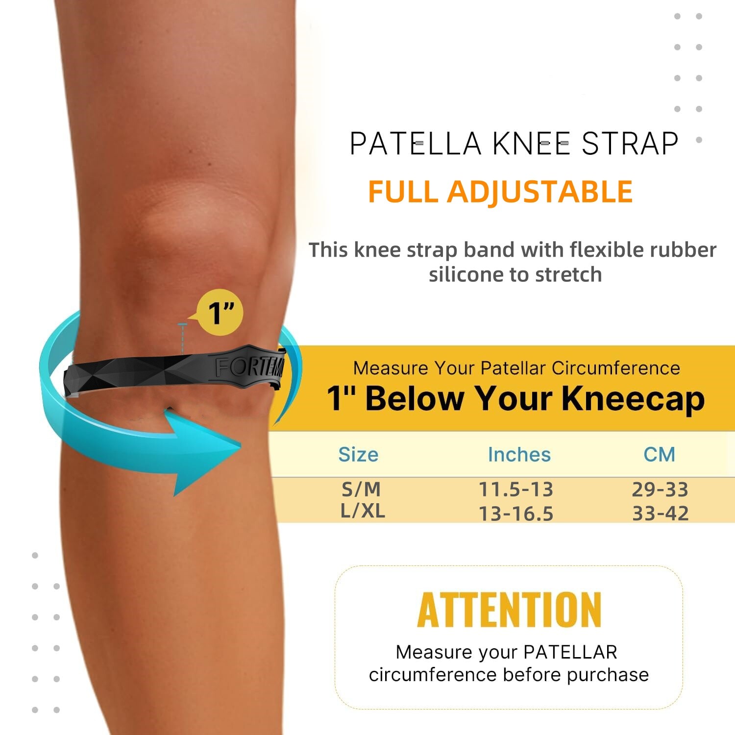 ✅FULL ADJUSTABLE - This knee strap band with flexible rubber silicone to stretch, S/M works for patellar circumferences of 11.5-13 inches, and L/XL works for patellar circumferences of 13-16.5 inches. A perfect knee brace strap ease your sizing worries away.