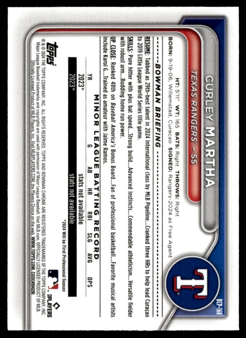 | 2024 BOWMAN CHROME PROSPECTS MOJO REFRACTOR CURLEY MARTHA TEXAS RANGERS #BCP-168 |