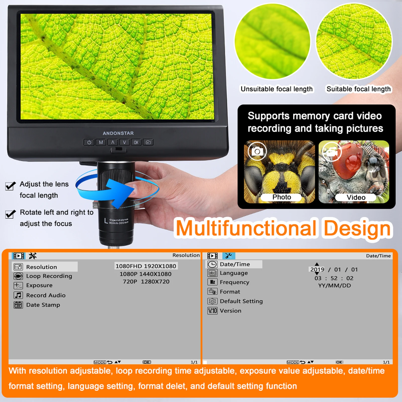 Industrial grade maintenance microscope, 10 inch LCD display, integrated imaging system with clear imaging quality, and the screen can be fliped at 180°. Adopts two quality optical lens, with 3-200X 90-300mm object distance and 13-80X 12-320mm object distance, with high imaging clarity. 1080P resolution and 0-4X adjustable display digital zooming design, support observe the microscopic details which is invisible to the eyes. With resolution adjustable, loop recording time adjustable, exposure value adjustable, date/time format setting, language setting, format delet, and default setting function.