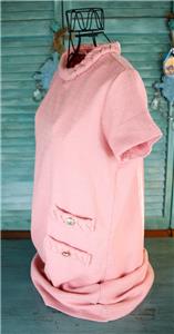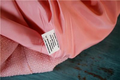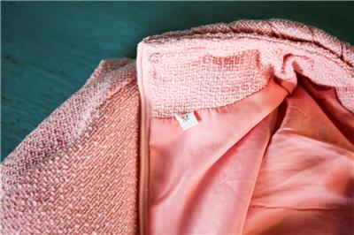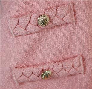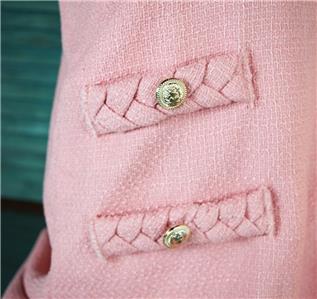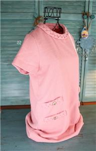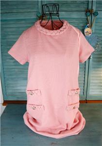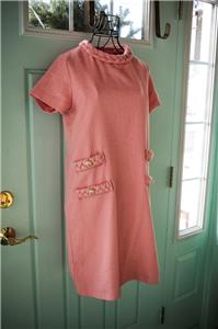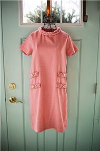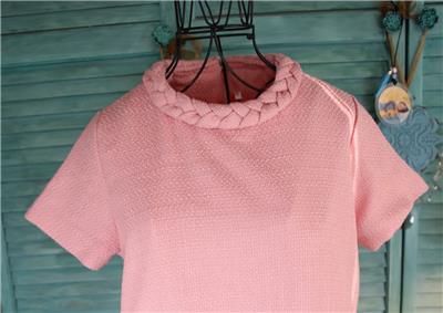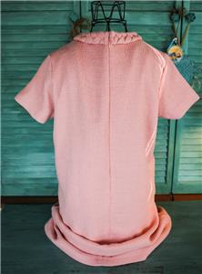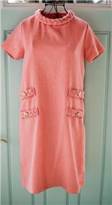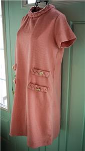 Cute Jackie O style dress with a great retro mod appeal. Pretty blush pink tweed with a braided neck and faux braided pockets accented with gold buttons that feature a lions head. Size medium, knee length or just above the knee, measures 35" in length, 38" bust, and 38" waist. Zips up the back with a hook and eye closure, 100% polyester and the pink silky lining is 95% polyester and 5% spandex, machine washable, no dryer. This dress is reminiscent of the Tuckernut brand. In gently used and clean pre-owned condition with no significant issues to note. Nice dress for Easter and the spring!