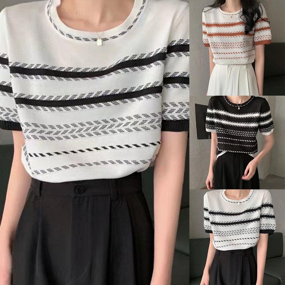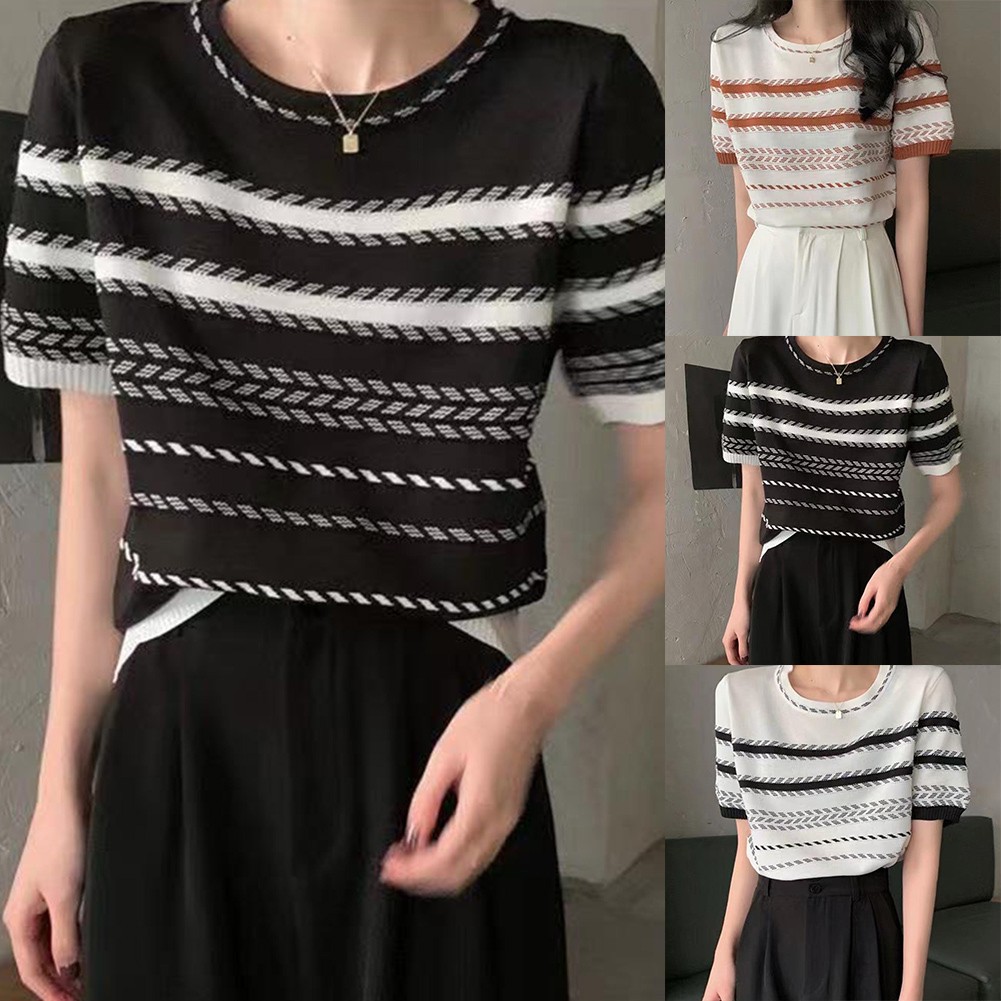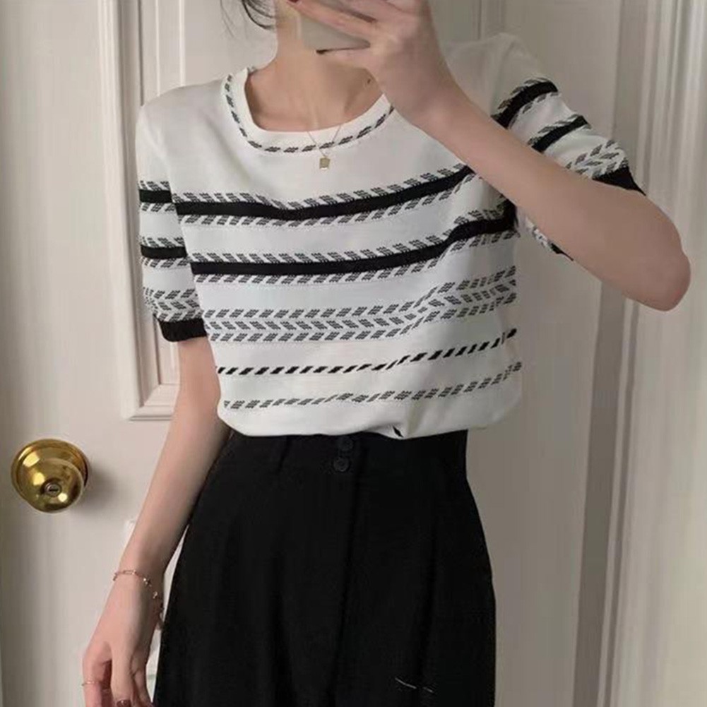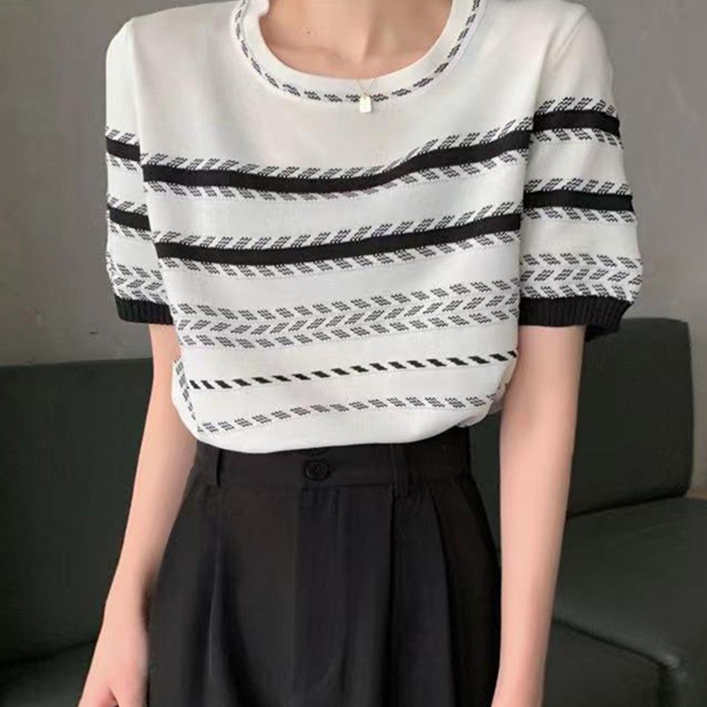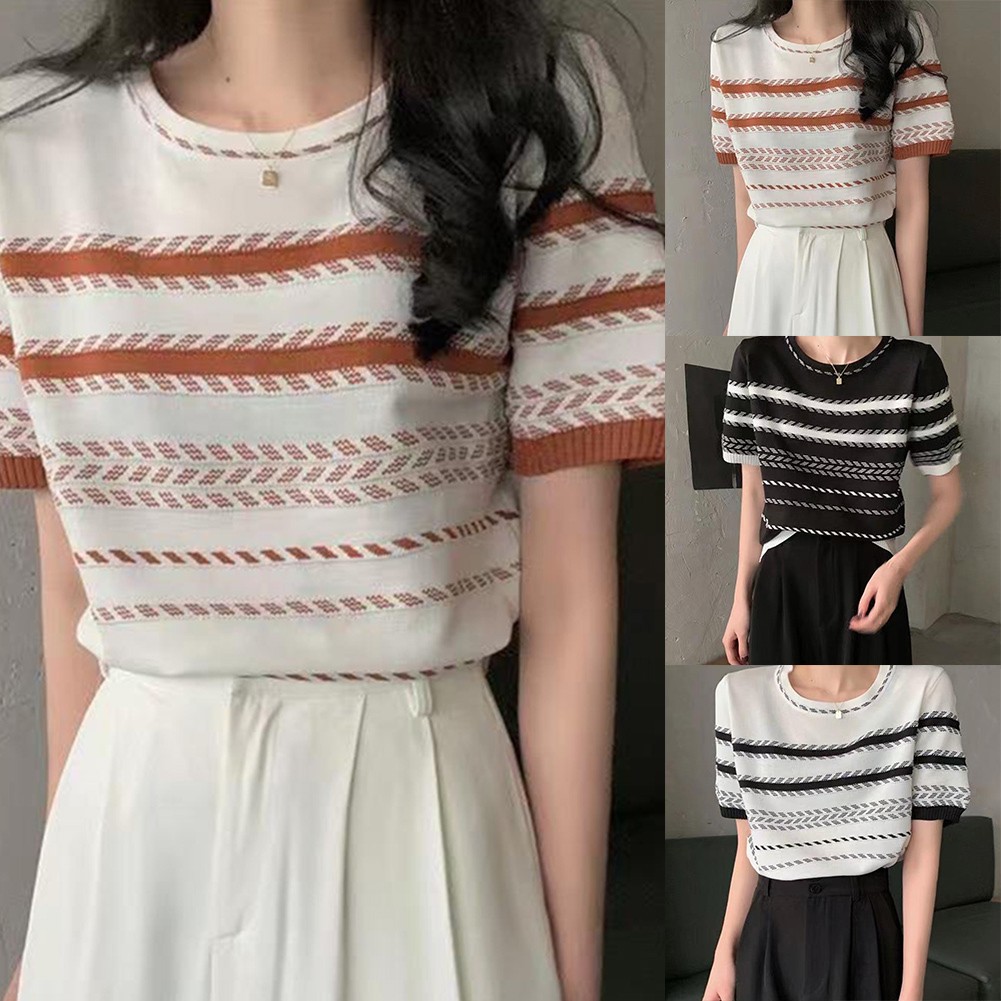 * Caractéristiques de l'article :Femme, t-shirt tricoté fin à manches courtes rayé été, haut décontracté mode vintage