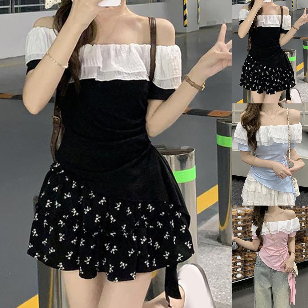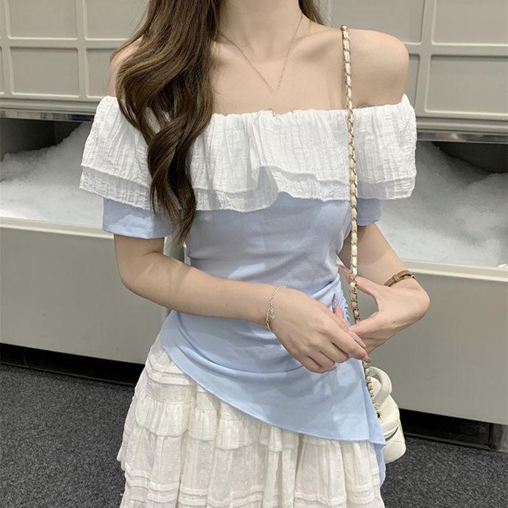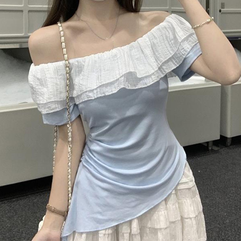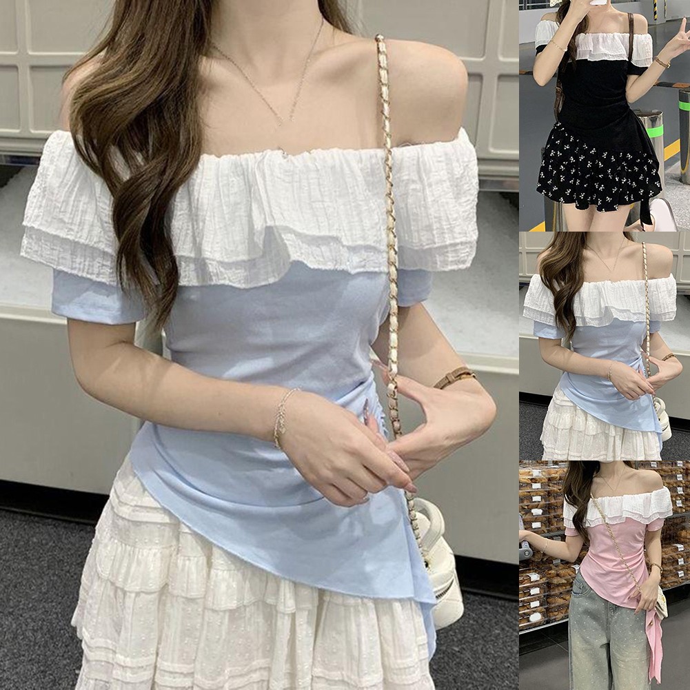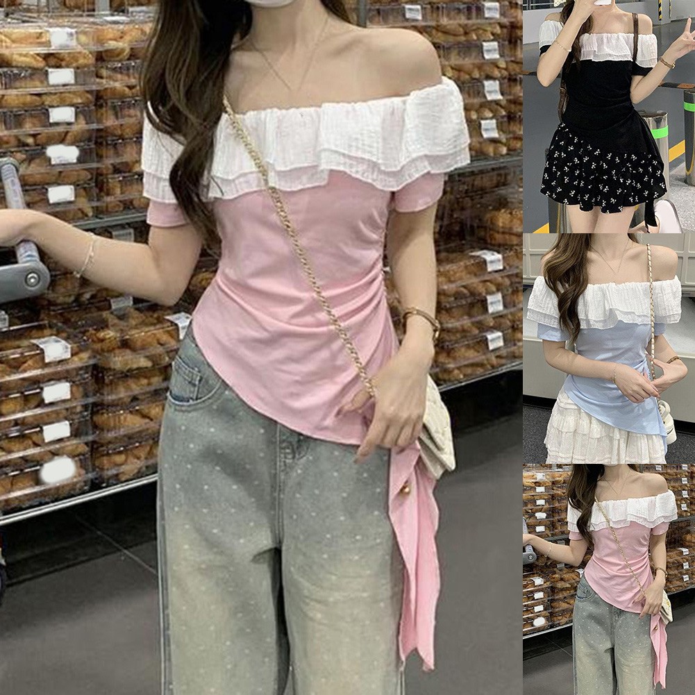 * Caractéristiques de l'article :T-shirt femme, été couleur unie à volants irréguliers épaules dénudées slim manches courtes, mode vintage hot girl top