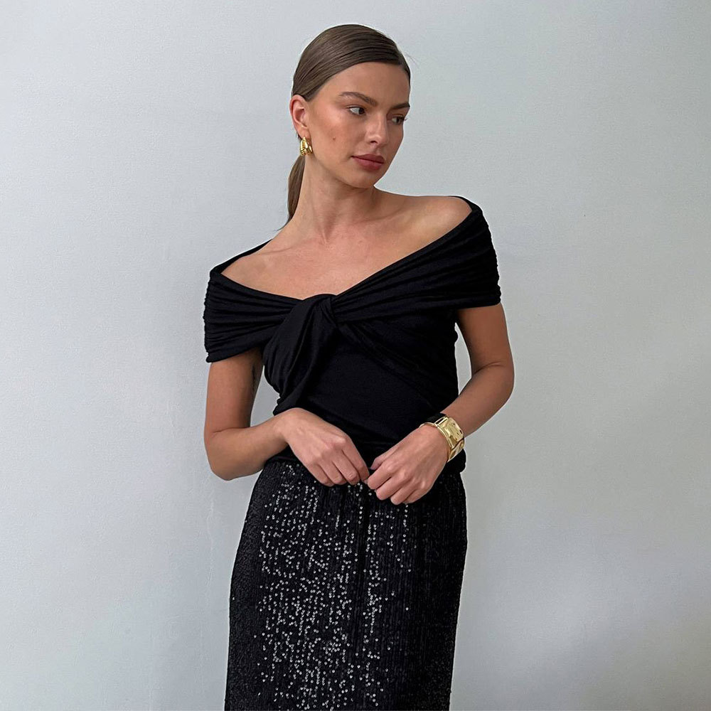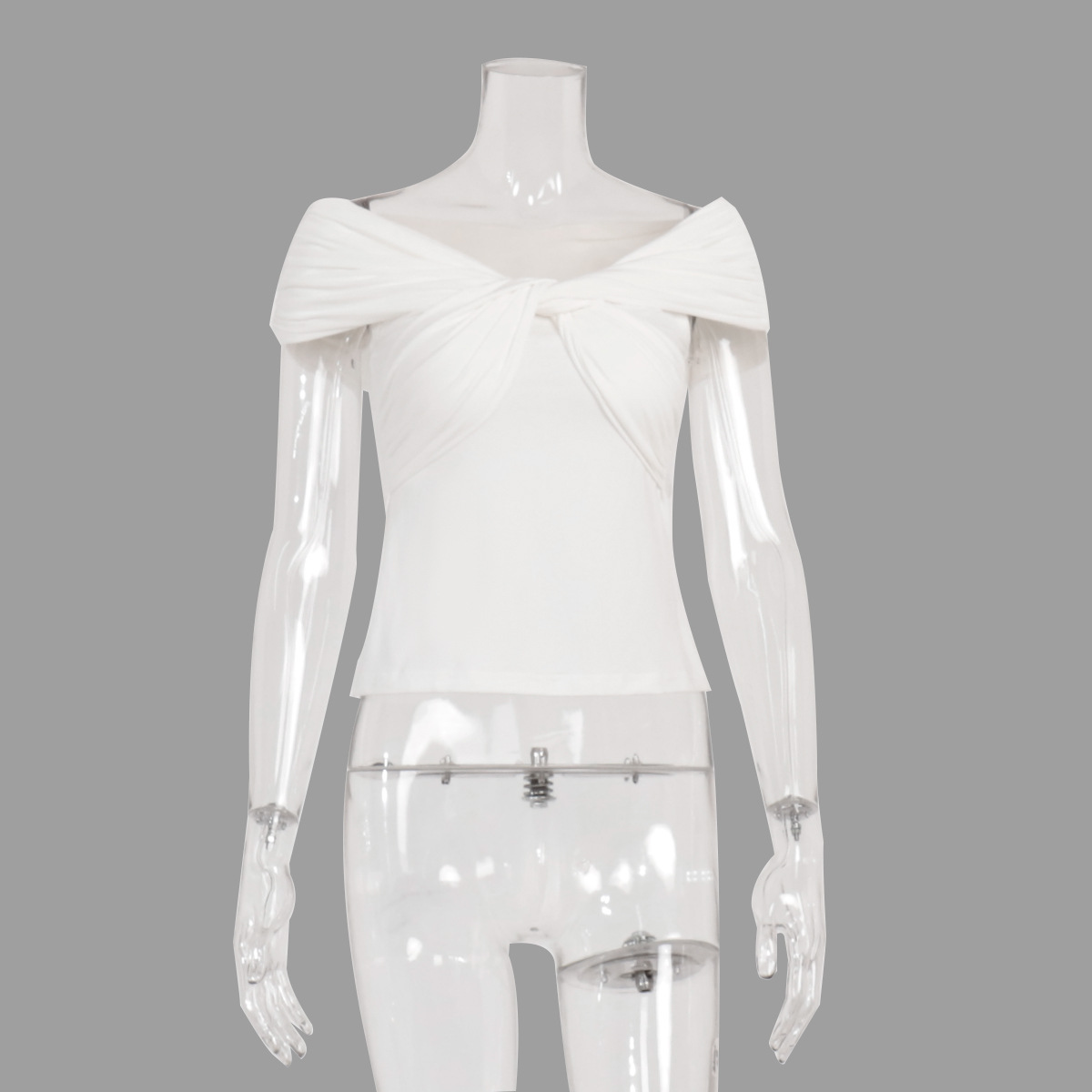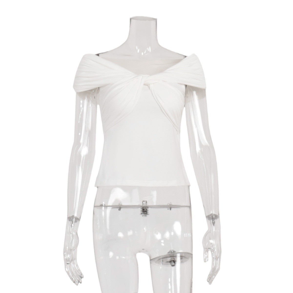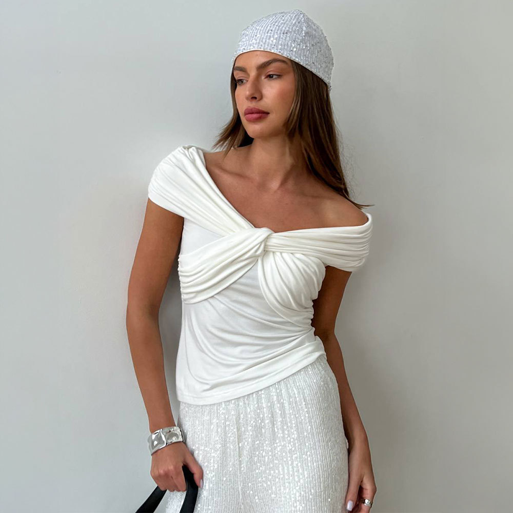 Top pleated V-neck off-the-shoulder short-sleeved T-shirt