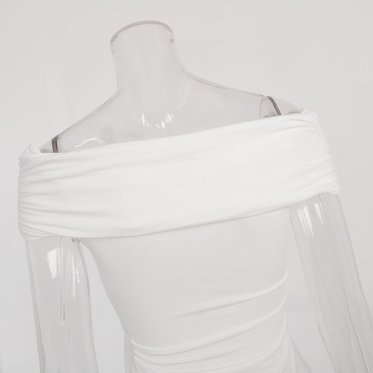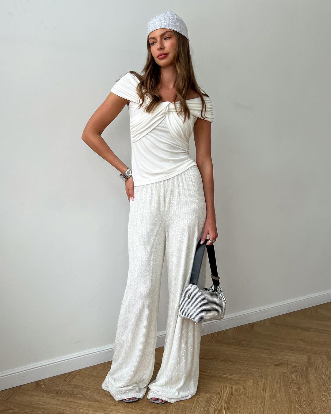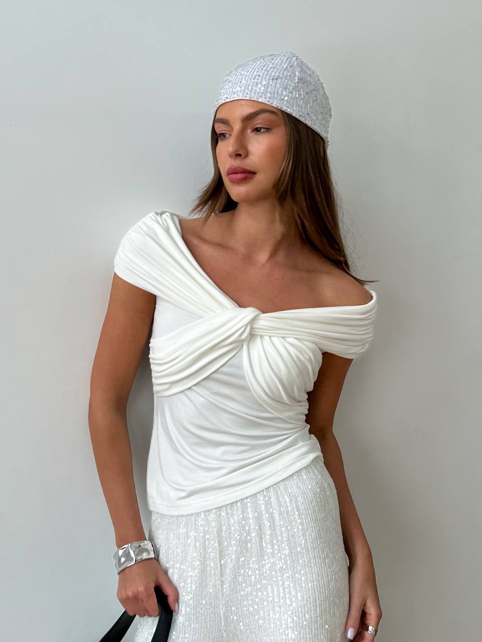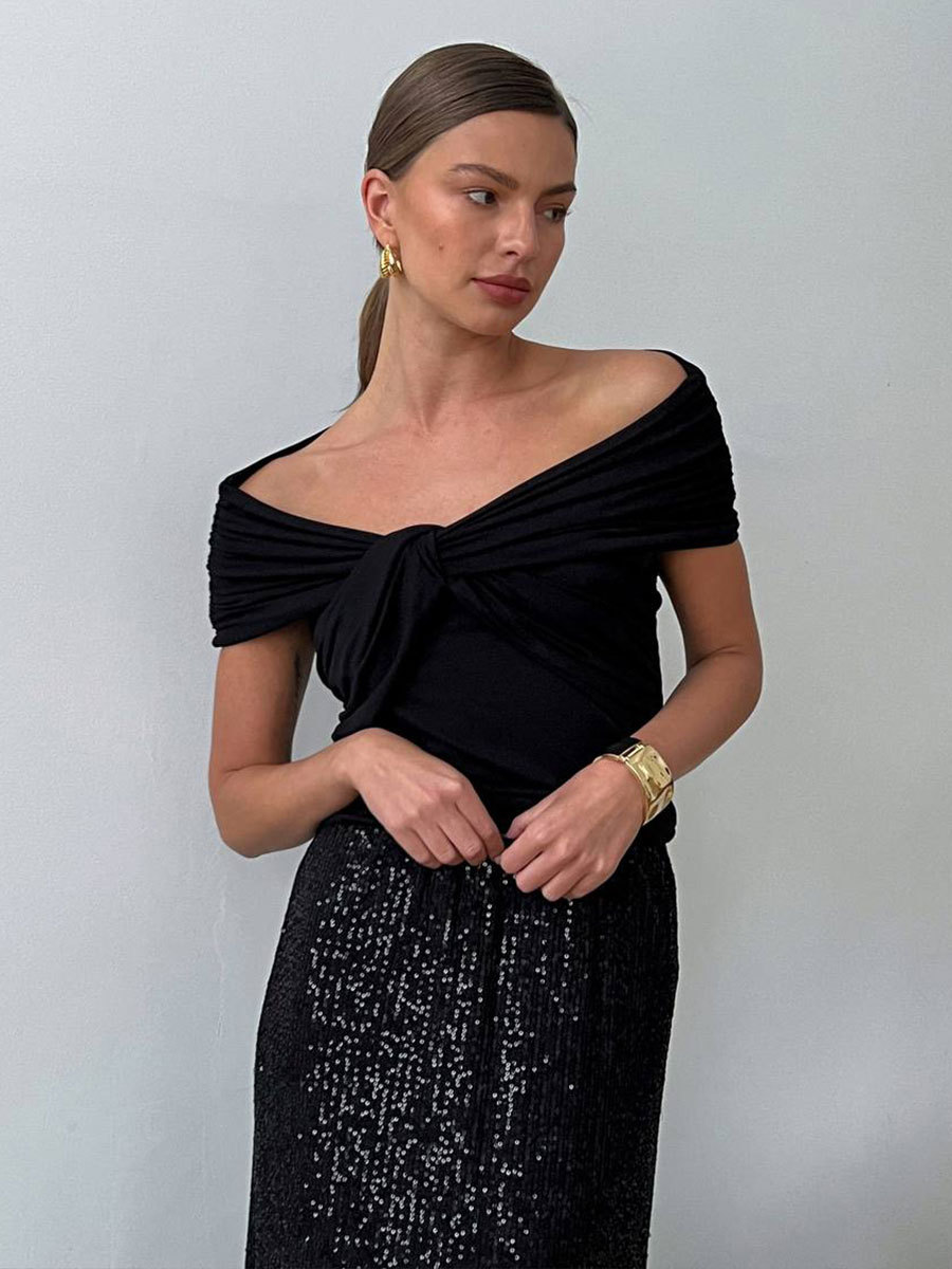 Top pleated V-neck off-the-shoulder short-sleeved T-shirt