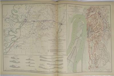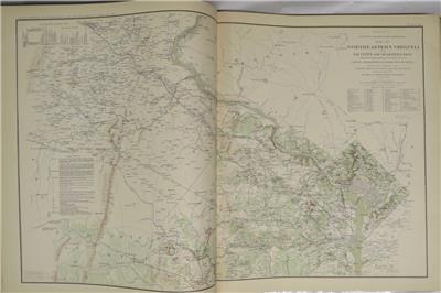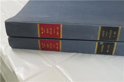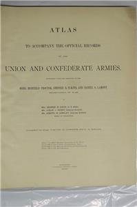Uncommon. This is truly an excellent condition, first edition, complete set of the Atlas to Accompany the Official Records of the Union and Confederate Armies. Almost all maps are in fine condition. Those that aren't are in fine - condition due only to a very few having a couple, very small edge chips. Well above average. Overall this is the finest set I have seen in over 25 years of antique book selling. The maps and illustrations are in excellent, clean, sharp, bright condition. They have been well protected by the two, sturdy, binding covers. The exterior binders are in light blue cloth covers with bright gold lettering and highlights on blue and red spine backgrounds. The have very light aging to the exterior and a small ship to one spine back ground; they are strong and sturdy. They measure 18 ½ inches by 15 ¾ inches by 1 7/8 inches. The An excellent condition, first edition, complete set.