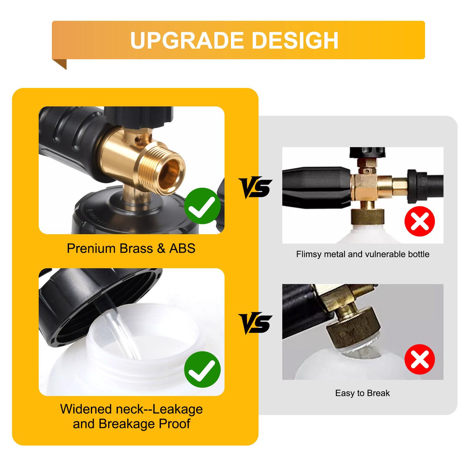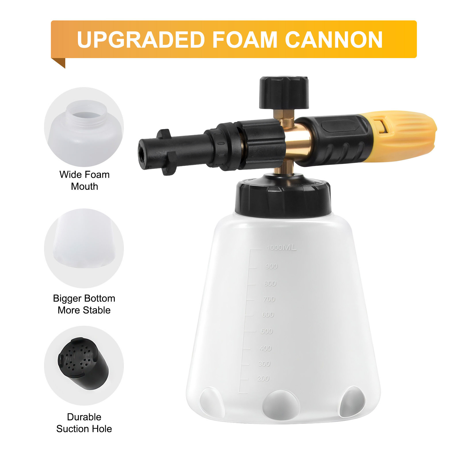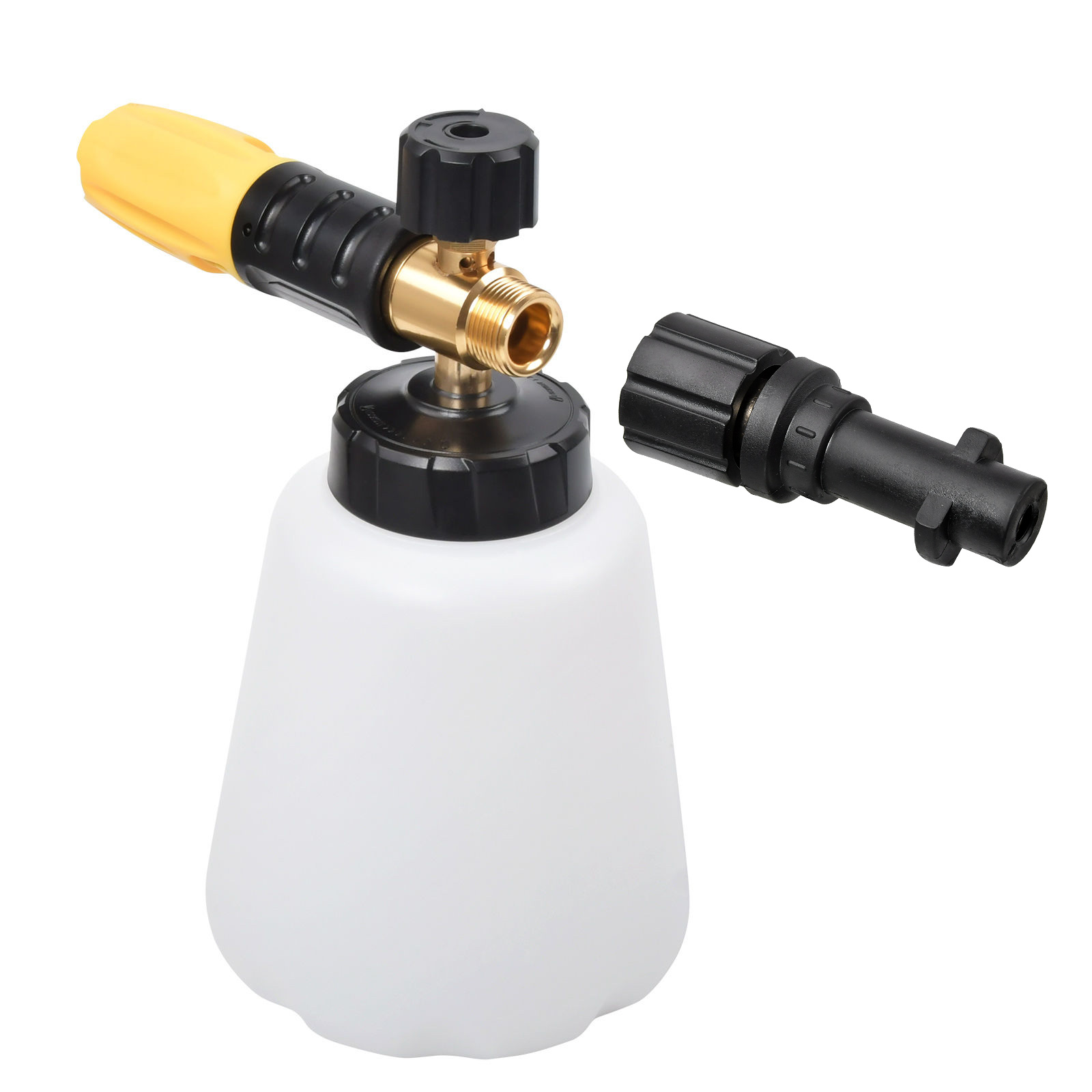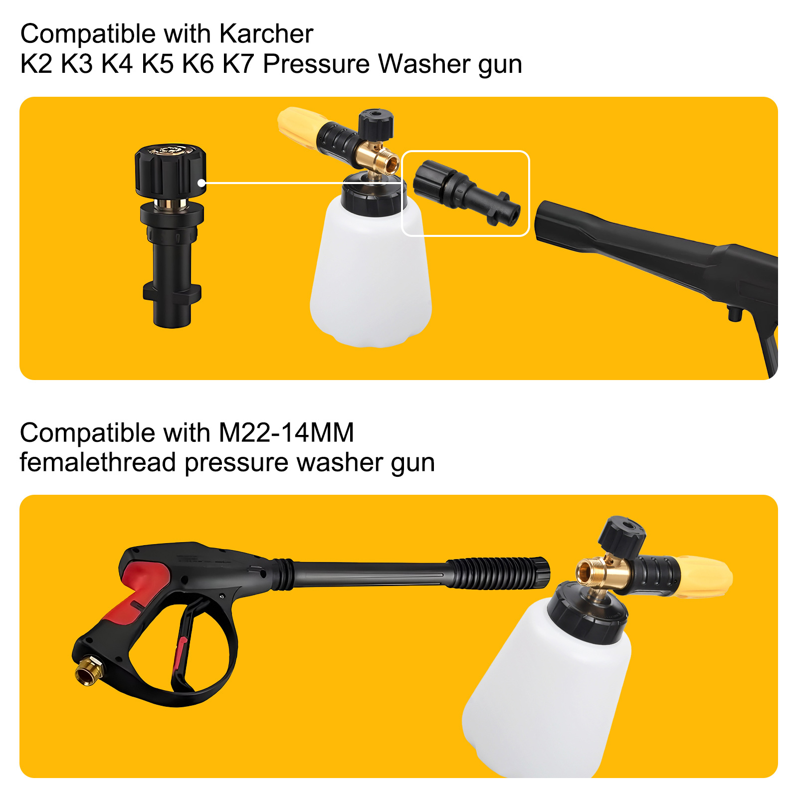 [VERBESSERTE SCHNEESCHAUMLANZE] Hergestellt aus robustem Messing und hochwertigem technischem Kunststoff, verhindert Korrosion und sorgt für eine dichte Abdichtung, kein Grund zur Sorge über Undichtigkeiten; Der verstärkte weite Hals verhindert Risse und lässt sich leicht mit Seifenwasser füllen. Einfacher Austausch der Düsenöffnung – einfach das M22-Innengewinde am schwarzen Adapter für Karcher abschrauben, schon können Sie den Zustand prüfen und die Düse austauschen