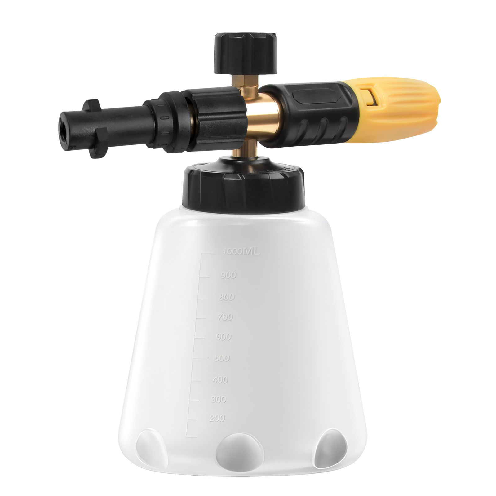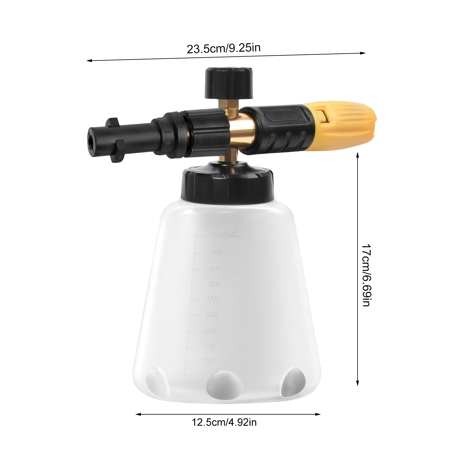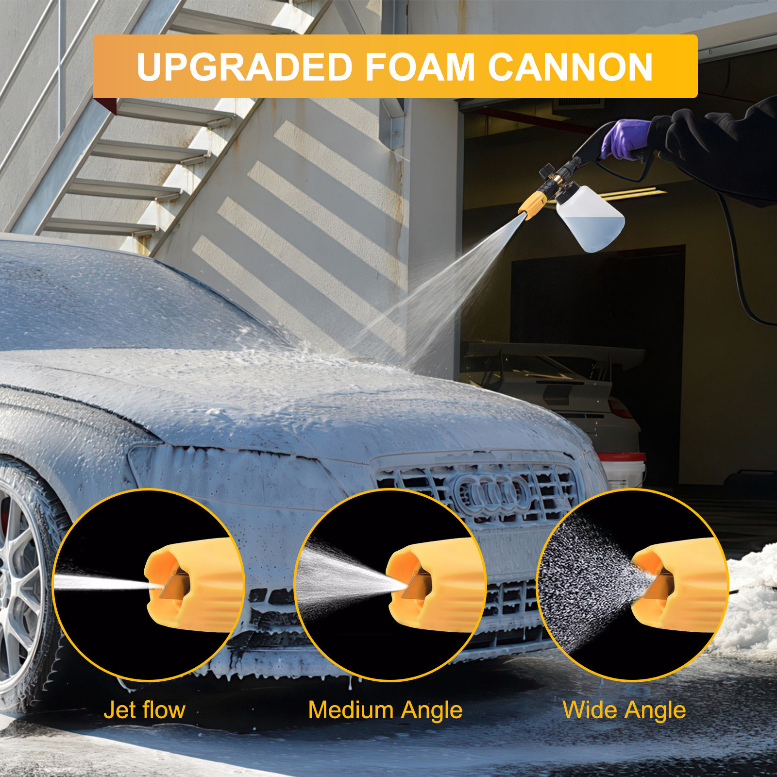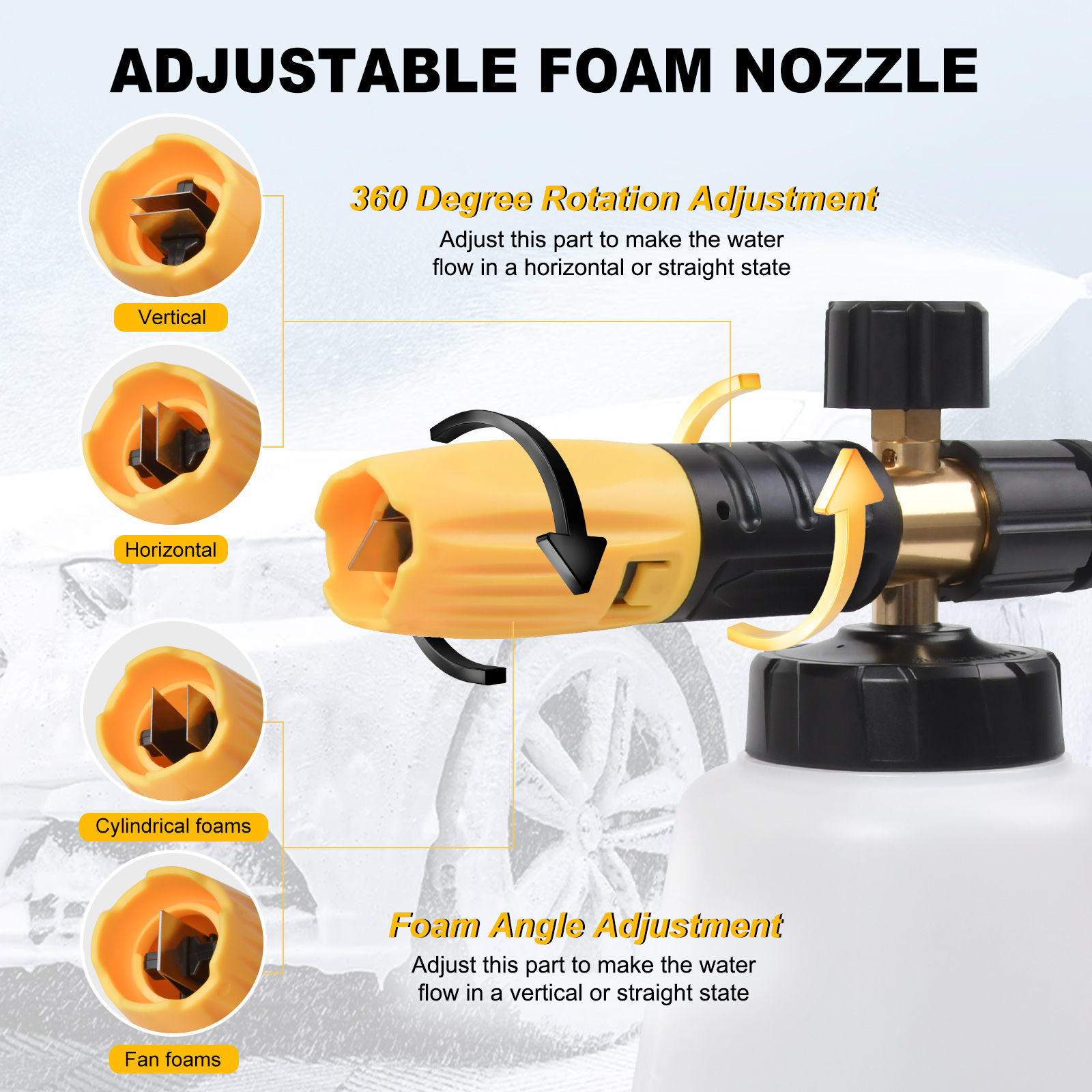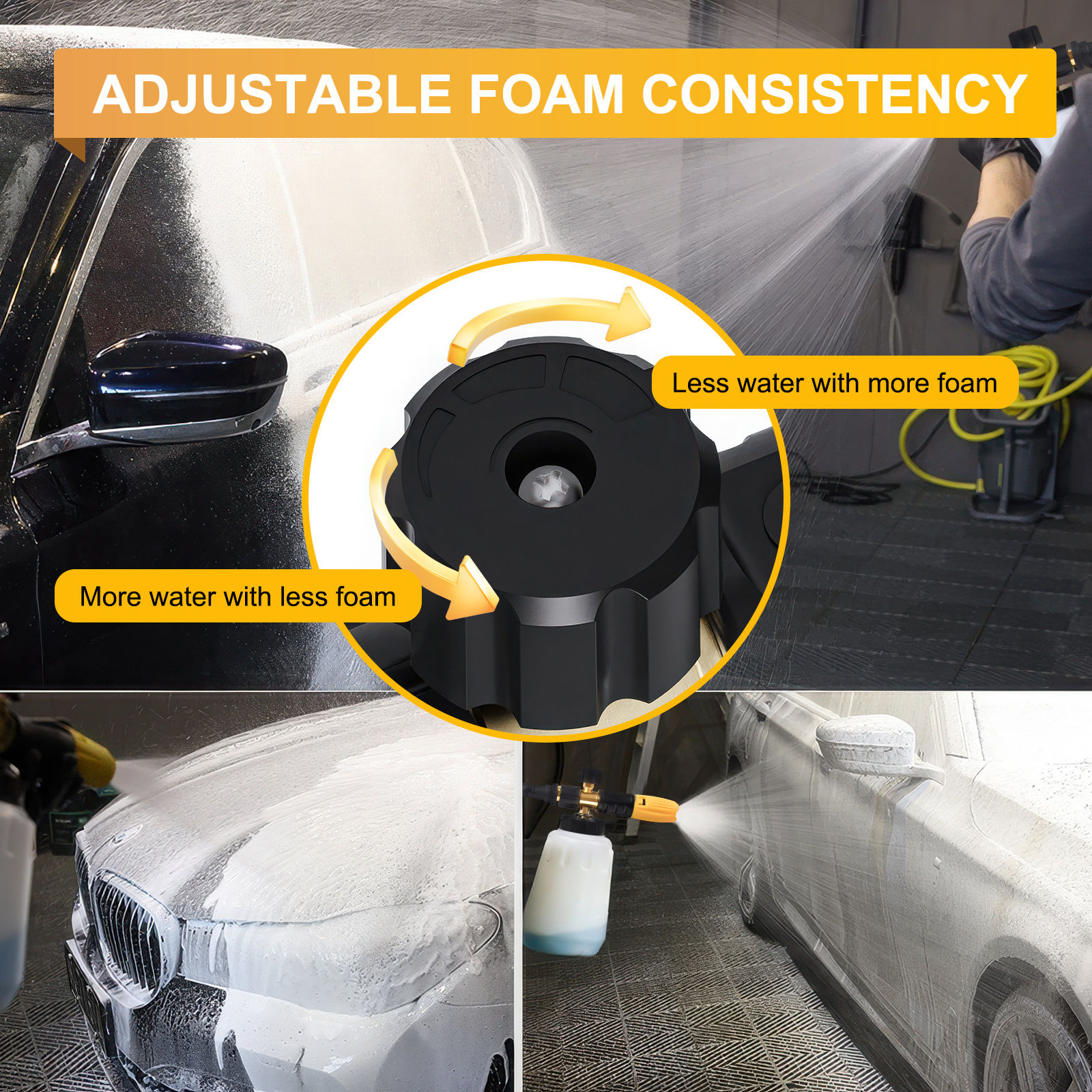 [UNIVERSELLE ANWENDUNG] Die professionelle Schaumlanze ist ein guter Reinigungshelfer. Der um 360° verstellbare Sprühstrahl und der Einstellknopf für die Schaumkonzentration an der Oberseite vervollständigen problemlos den Übergang von leichtem Schaum zu dickem Schaum und erhöhen so das Reinigungserlebnis und den Spaß. Der dicke Schaum löst Flecken und Schmutz schnell und mit Schaumreinigungshandschuhen eignet er sich perfekt zum Waschen von Autos, Motorrädern, Böden, Fenstern, Einfahrten, Dächern, Fassadenverkleidungen und mehr.