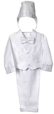 The short formal set is all made out of quality satin. It consists of the vest, short sleeve shirt, bowtie, short pants and cap. It is adorned by delicate and rich embroidered design of cross and dove in front.