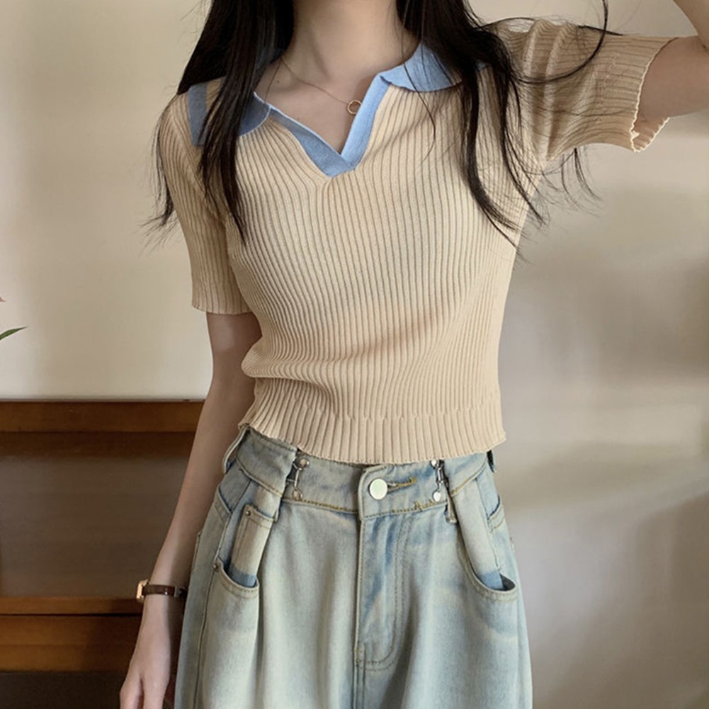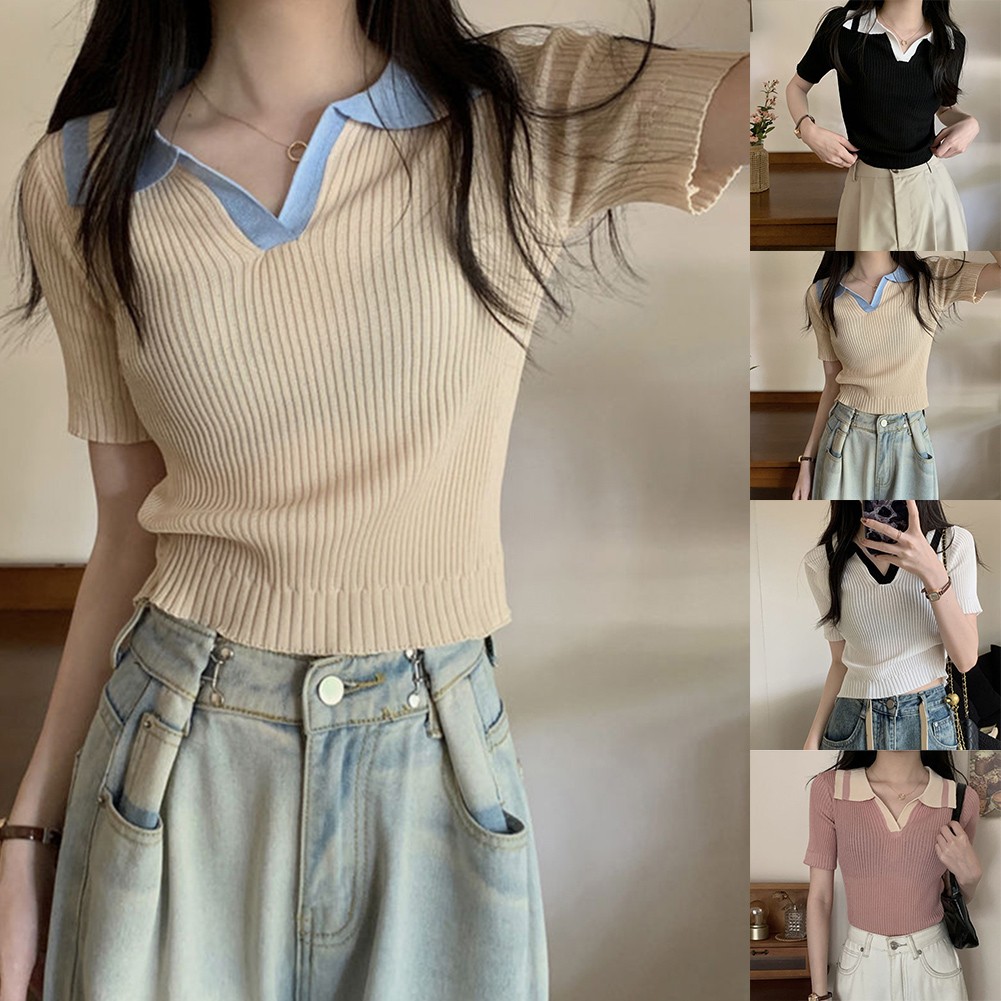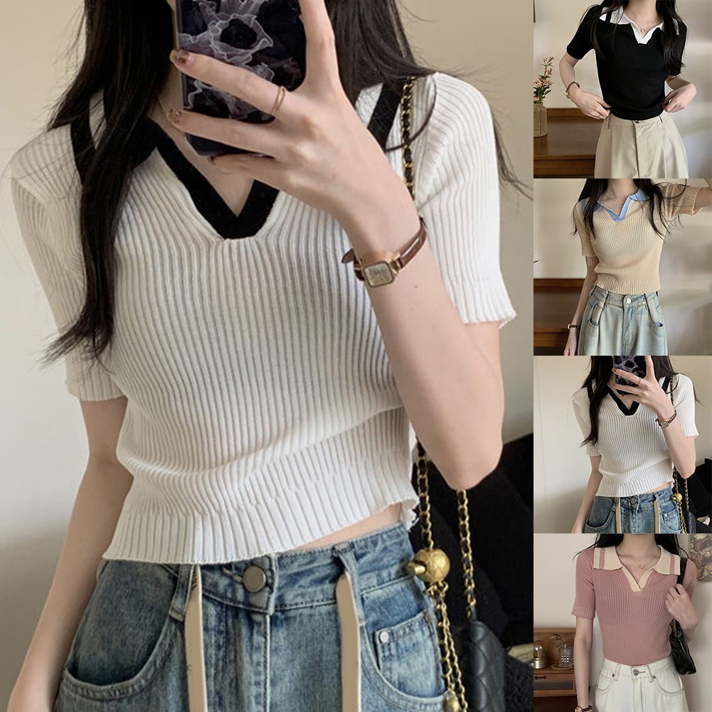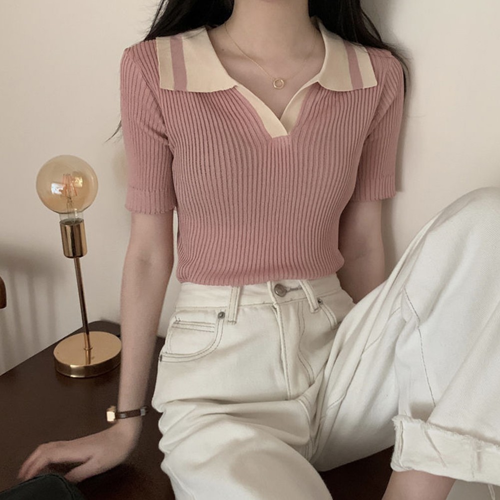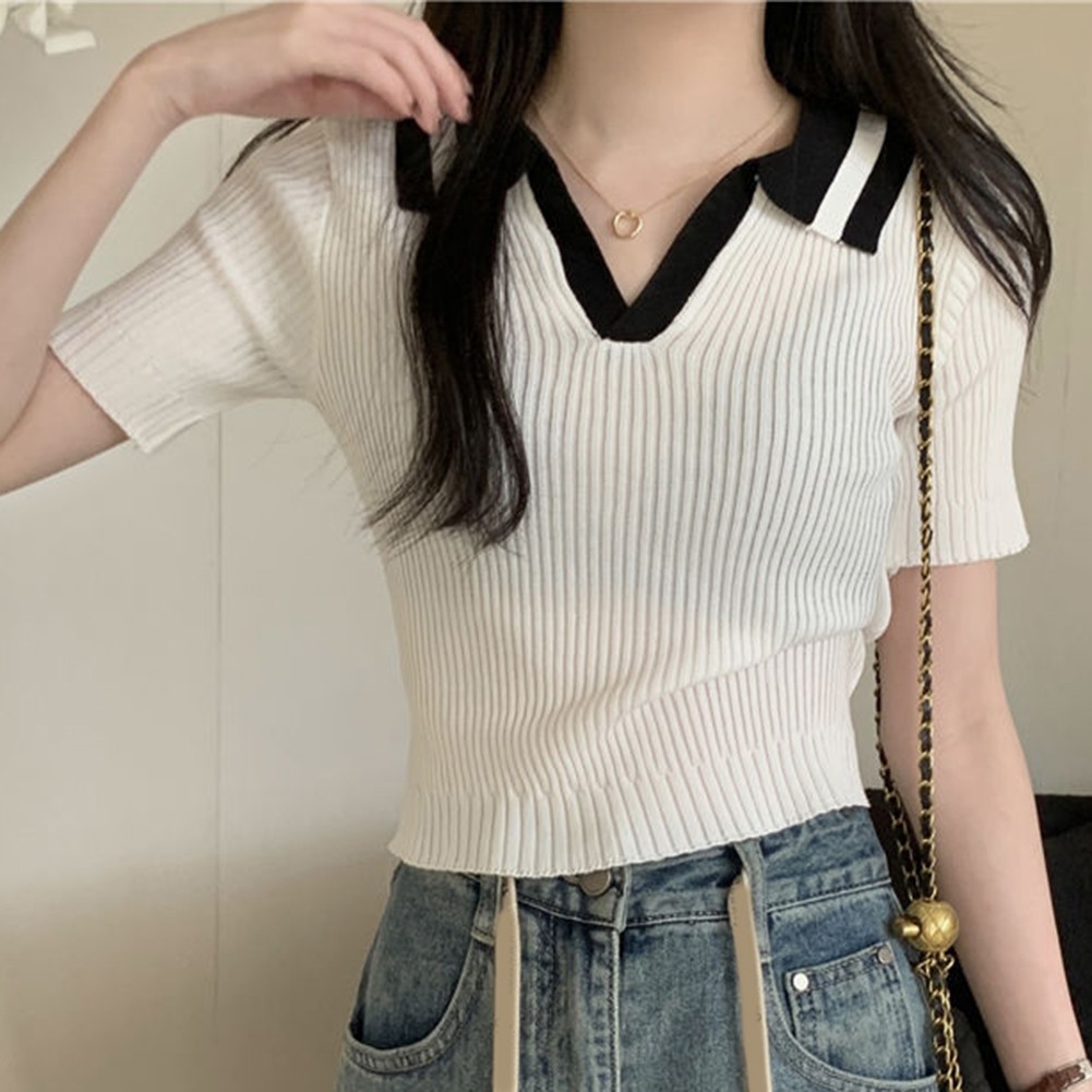 * Caractéristiques de l'article :Femmes, t-shirt à revers fin à manches courtes en soie glacée couleur contrastante été, haut décontracté mode all-match