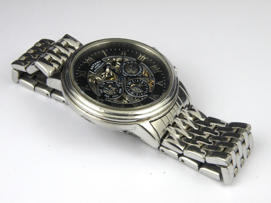 You are bidding for a Rotary Men’s Automatic Skeleton Watch with Silver Dial Analogue Display and Stainless Steel Bracelet GB00242/04. This is in perfect working order and keeps good time. This has a stunning skeleton dial. This is in excellent condition. Dial has a few scratches. This comes with original Rotary bracelet and fits up to 17.5cm.