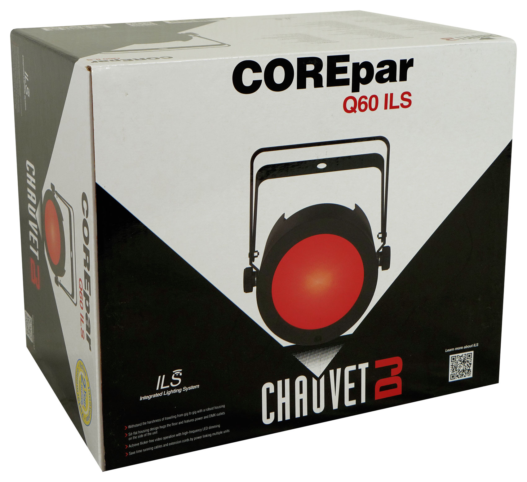 COREpar Q60 ILS is a 60-watt quad-color (RGBA) COB (Chip-on-Board) LED that produces a full spectrum of light with unsurpassed color mixing. Its robust housing withstands the harshness of traveling from gig to gig and its sit-flat housing design hugs the floor and features power and DMX outlets on the side of the unit for easy connections. Among the powerful features of the COREpar Q60 is ILS compatibility for use in the Integrated Lighting System (ILS) ecosystem that makes creating coordinated light shows across different fixture types easy. D-Fi USB compatibility is also board for wireless Master/Slave or DMX control. Achieve flicker-free video operation with high-frequency LED dimming and the included magnetic Fresnel lens allows the flexibility to go from ultra-wide to narrow beam in seconds. Create customized colors using the built-in LED display and achieve smooth LED fading with built-in dimming curves.