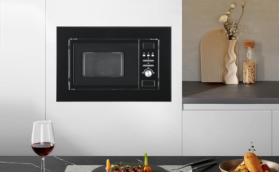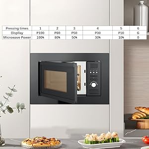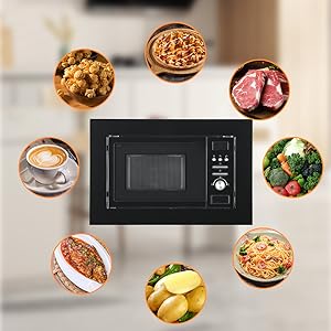 With the buttons on the integrated microwave oven, you can get potatoes, popcorn, pizza, vagetables, beverage, meat, pasta and fish.