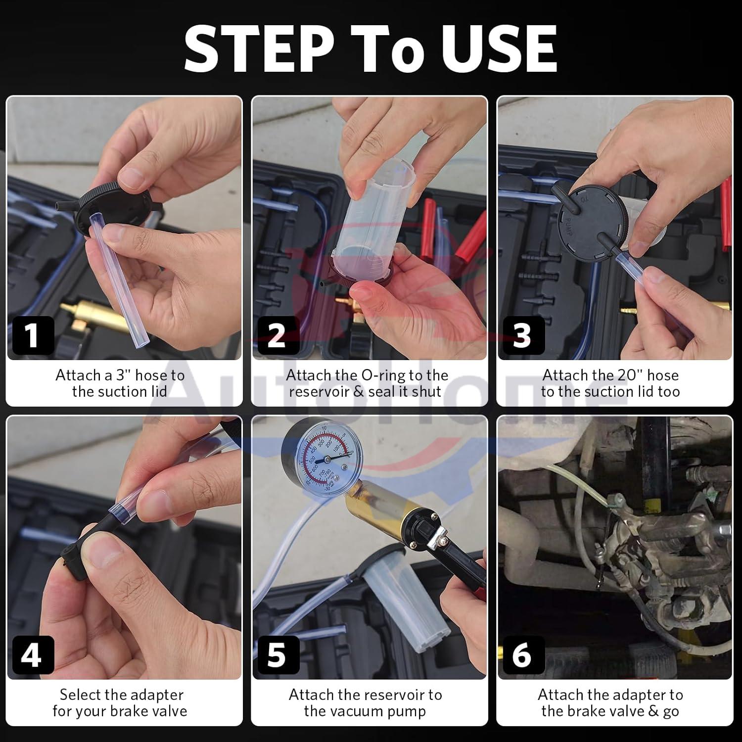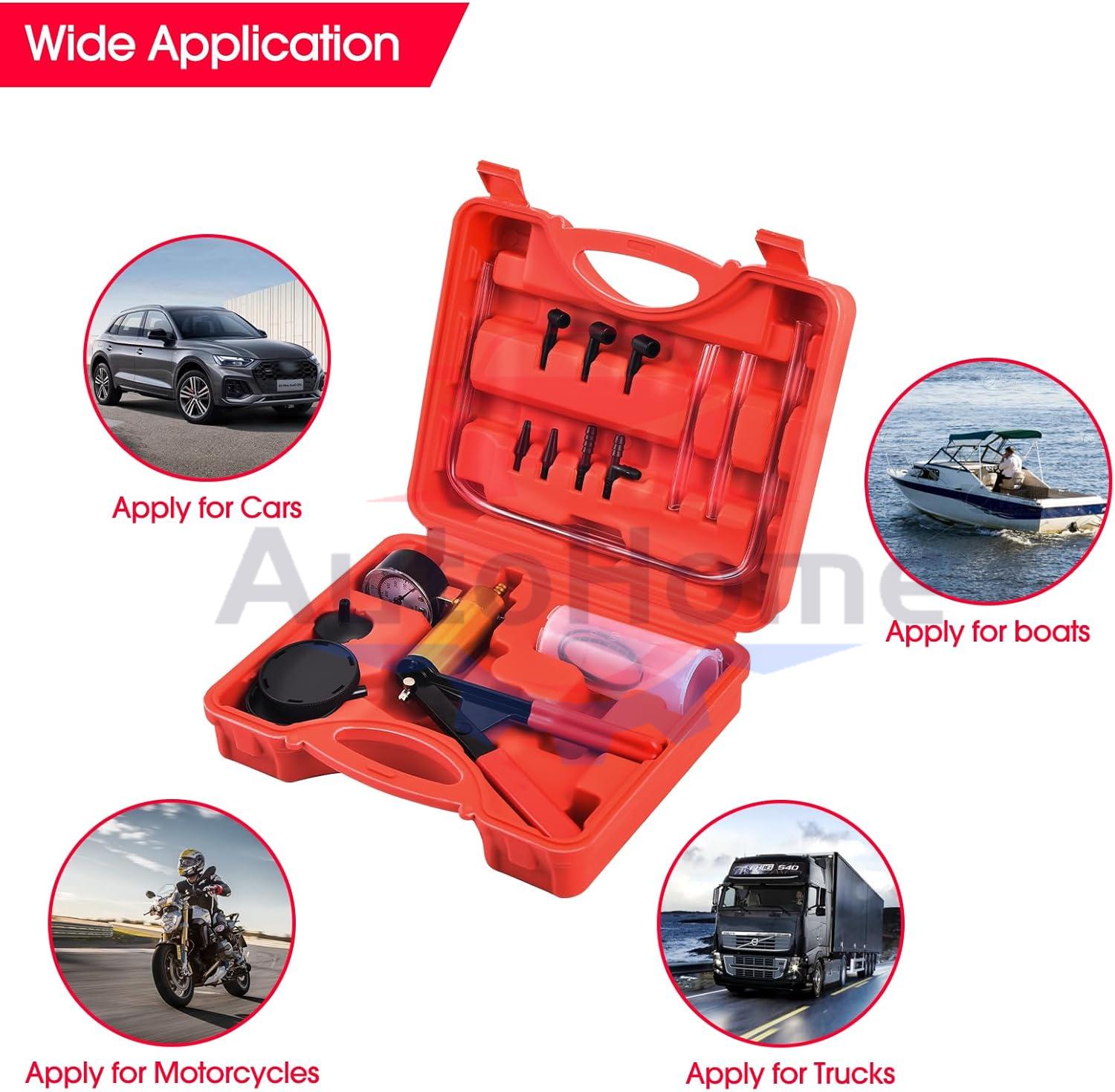 Automotive Brake Vacuum bleeder Kit;Multifunctional: The Vacuum Pump/Brake Bleeder is a multi-functional vacuum pump that is used to test a variety of essential vehicle settings and operations.Easy Usage: Hand vacuum pump is easy to bleed your car brakes.