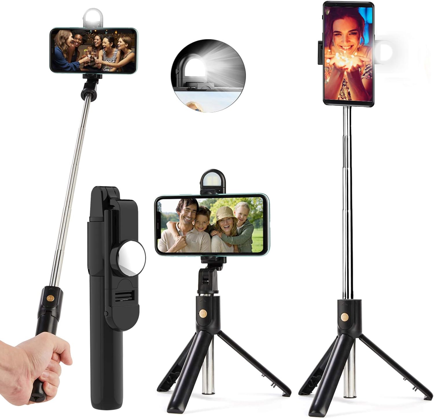 Selfie Stick Tripod, Extendable Bluetooth Selfie Stick with Fill Light and Wireless Remote for Selfie/Group/Photos/Vlog, Portable, Lightweight, Compatible with iPhone and Android Smartphone - Black