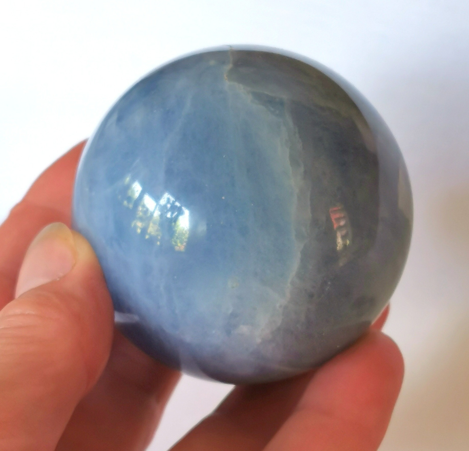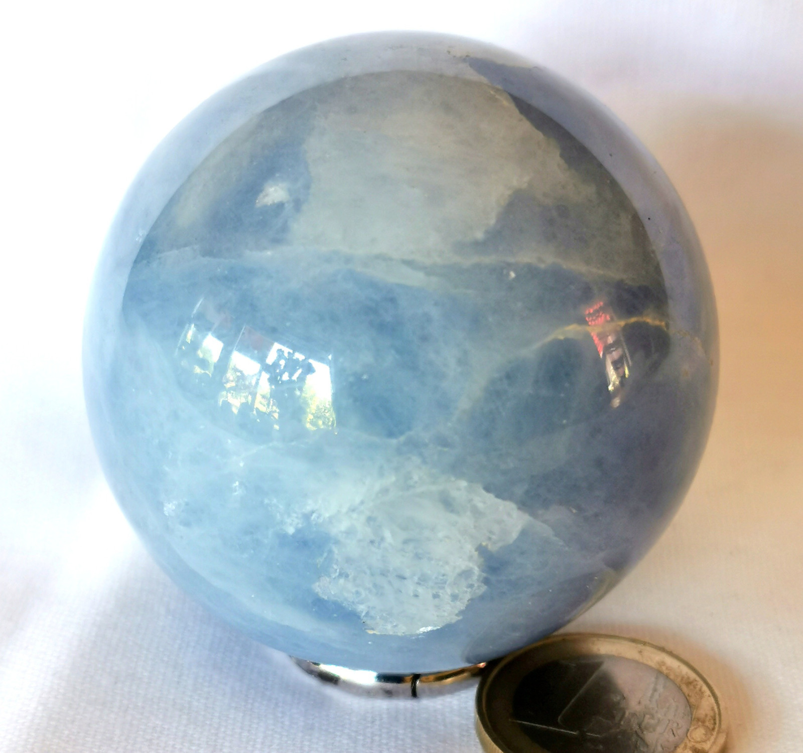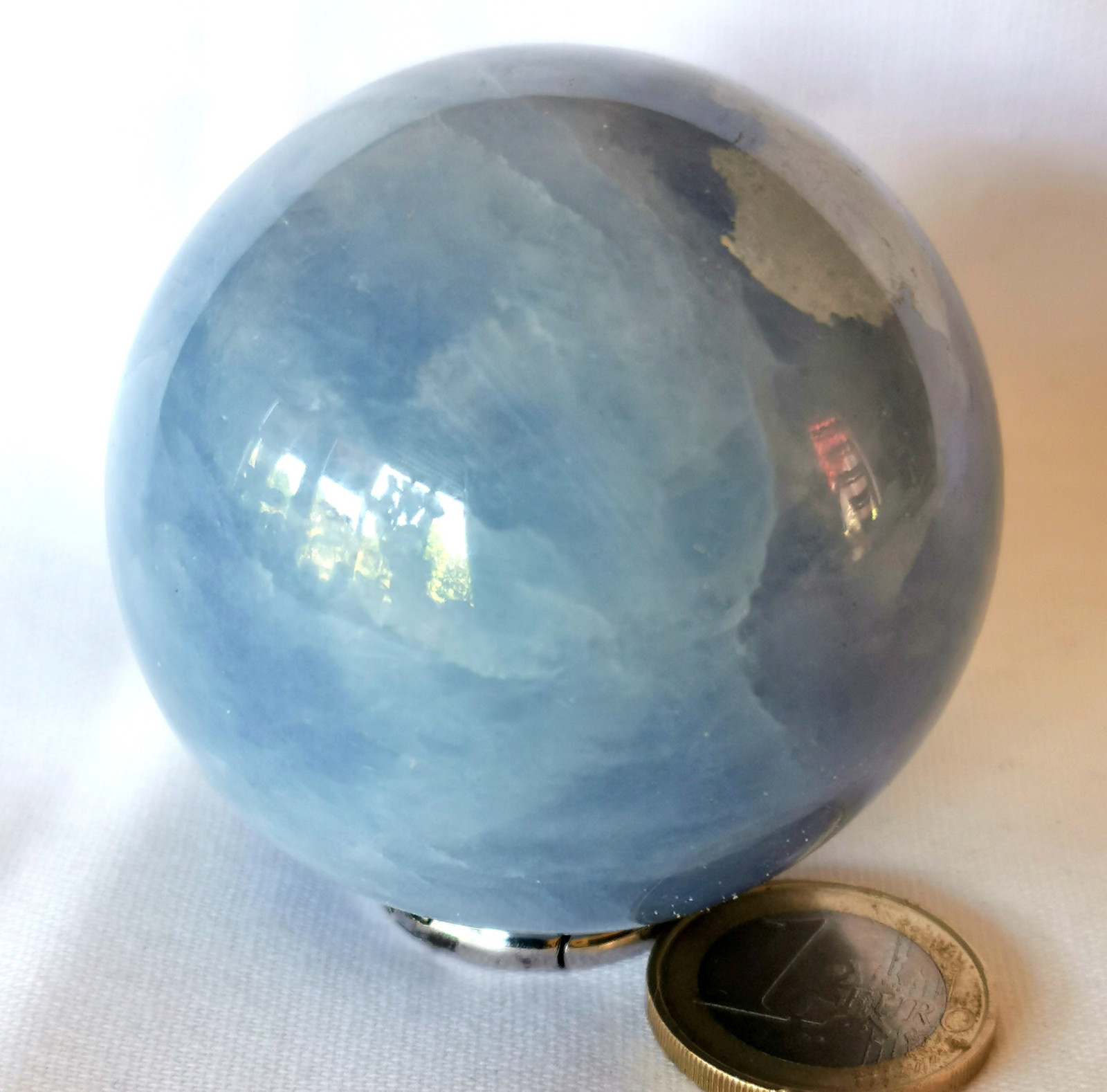 wunderbare blaue Calcit Kugel aus Madageaskar, Durchmesser ca. 57 mm, Gewicht 271 Gramm, geliefert wird nur die Kugel ohne die abgebildete Deko. ebay geht auf meine Kosten.