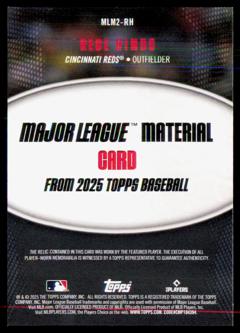 | 2025 Topps Major League Material Relics (Series Two) Rece Hinds Rookie | ||||||||||||||||||